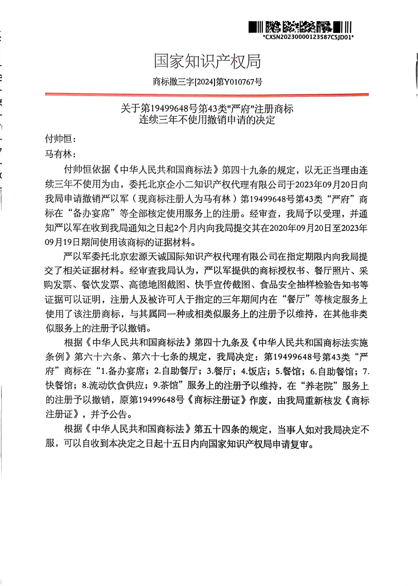 宏源天诚代理“严府”商标撤三答辩成功