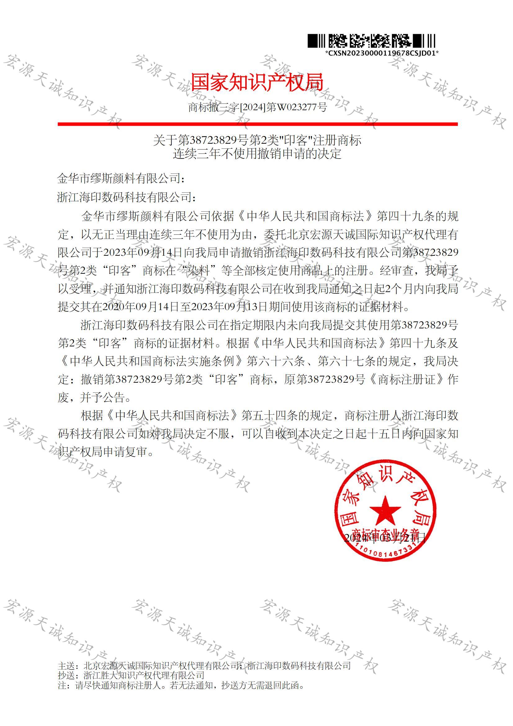 宏源天诚代理“印客”商标提撤三成功
