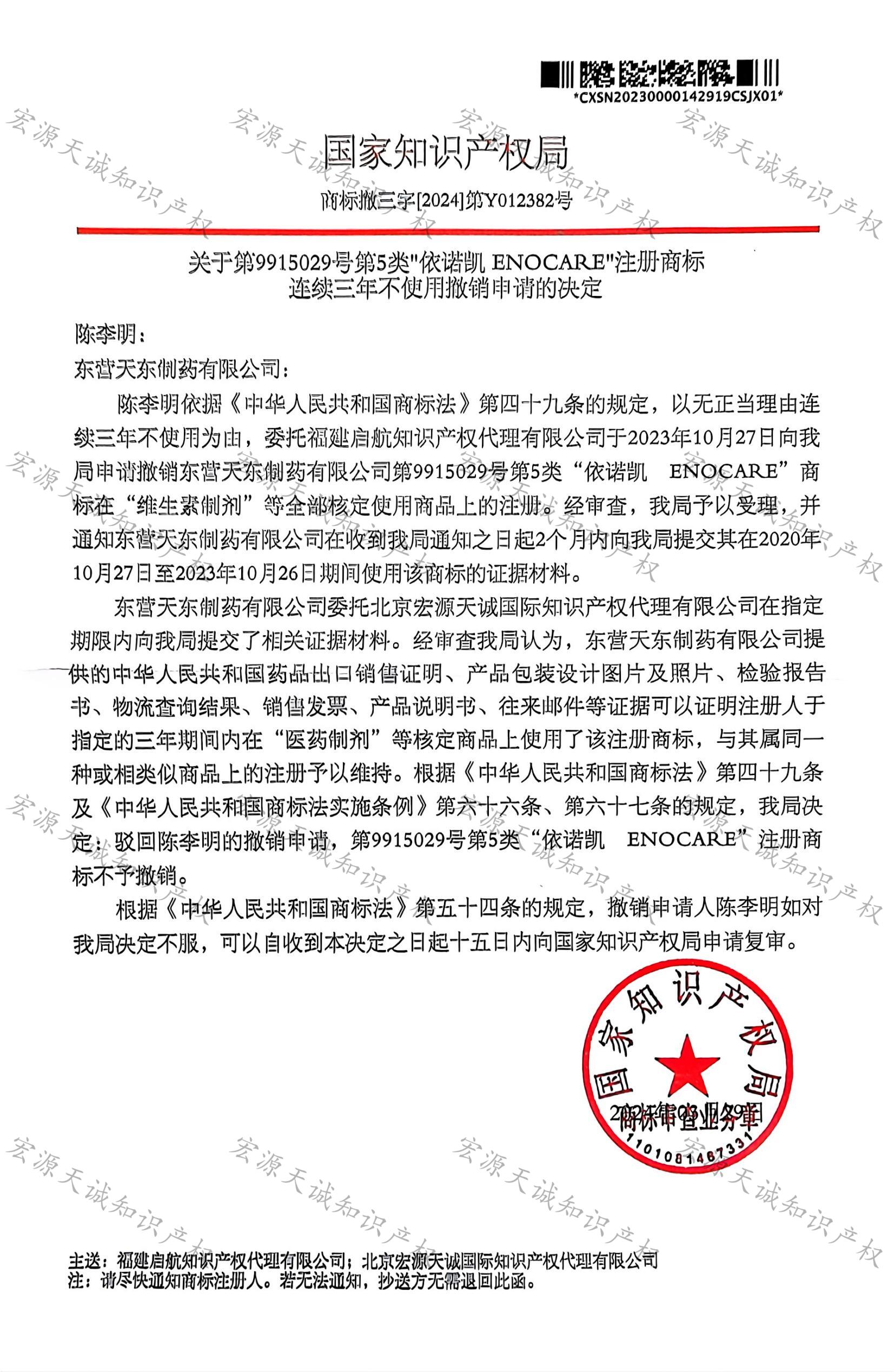 宏源天诚代理“依诺凯”商标撤三答辩成功
