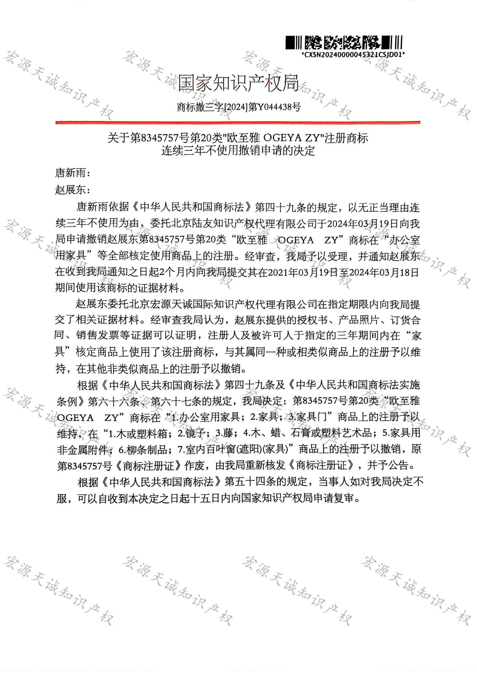 宏源天诚代理“欧至雅 OGEYA ZY”商标撤三答辩成功