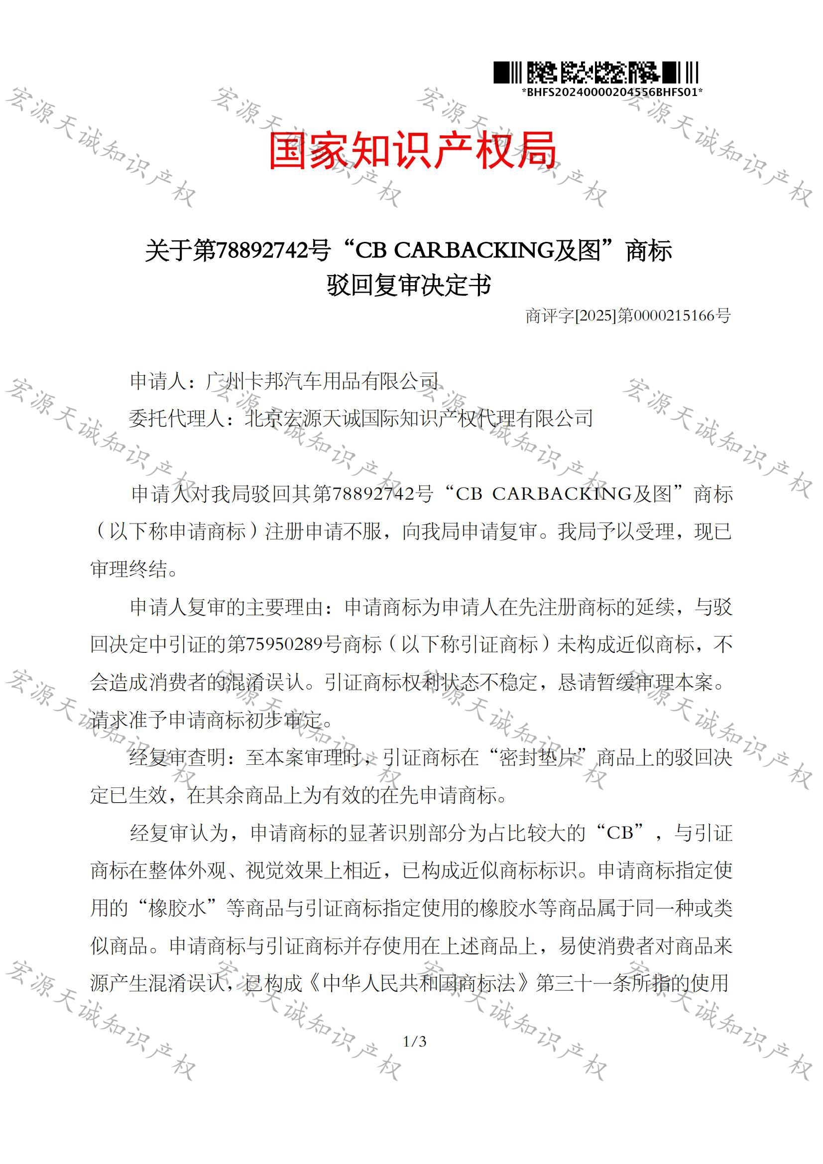 宏源天诚代理“CB CARBACKING及图”商标驳回复审成功