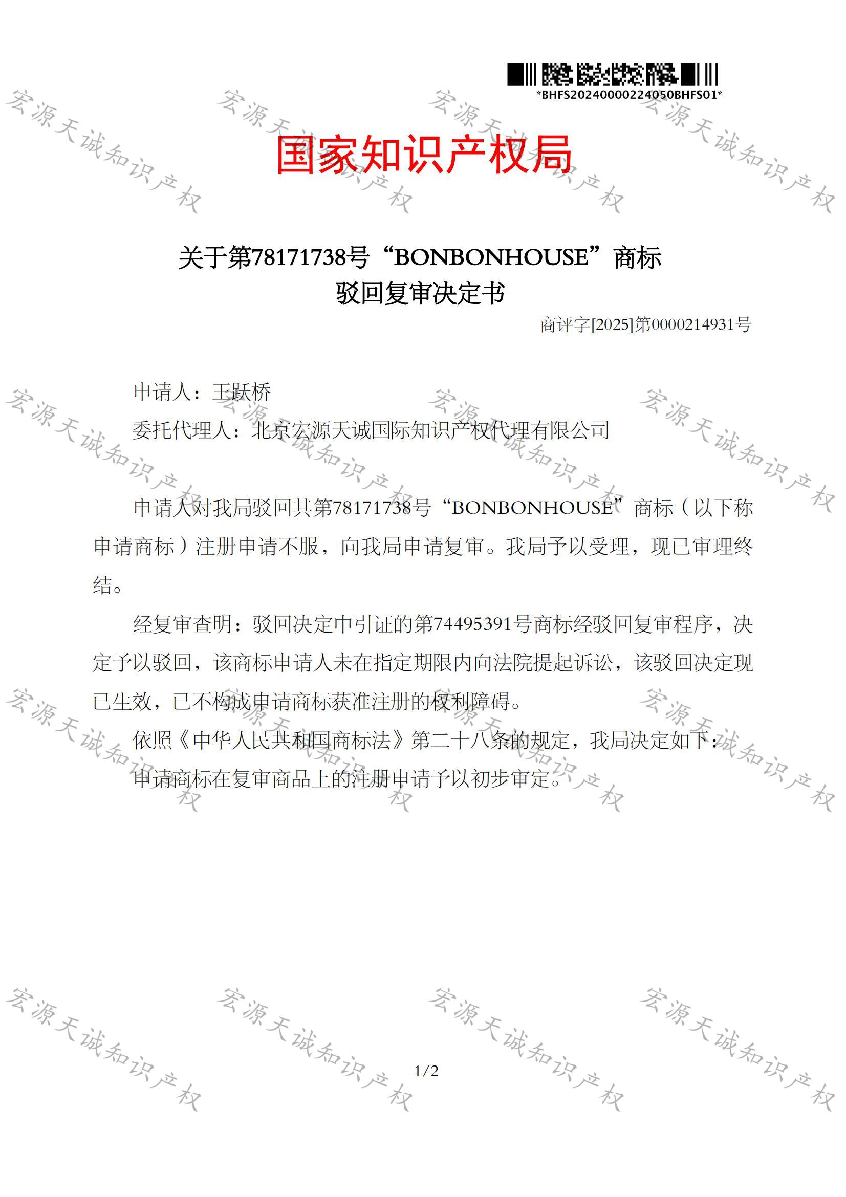 宏源天诚代理“BONBONHOUSE”商标驳回复审成功