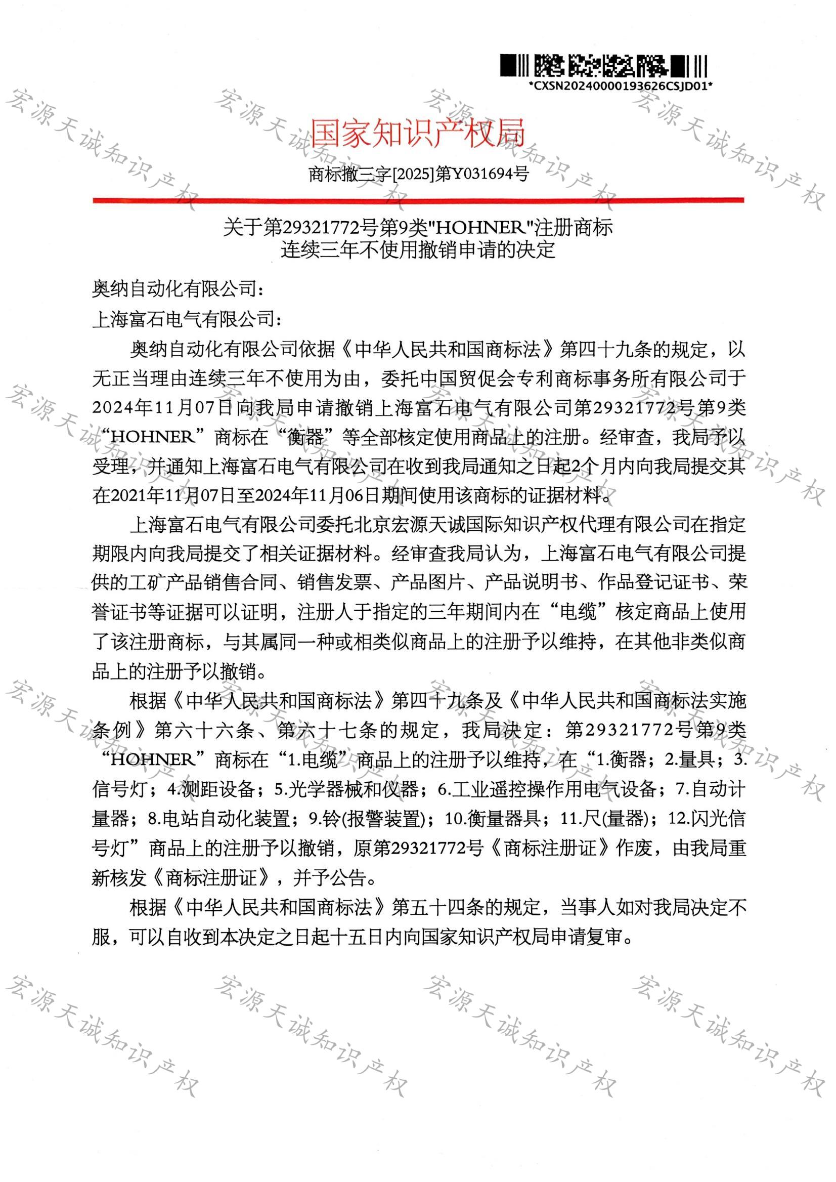 宏源天诚代理“HOHNER”商标撤三答辩成功