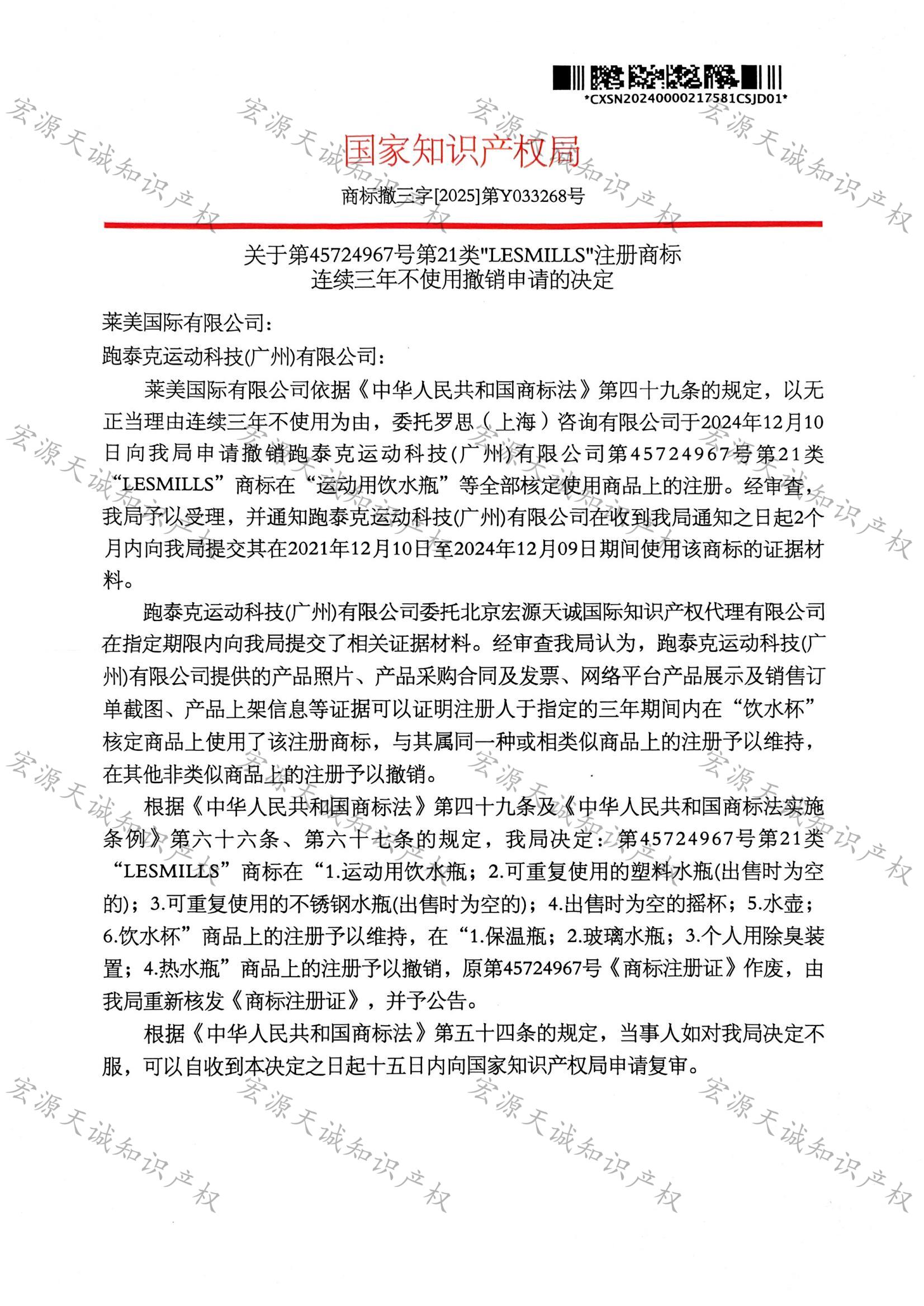 宏源天诚代理“LESMILLS”商标撤三答辩成功