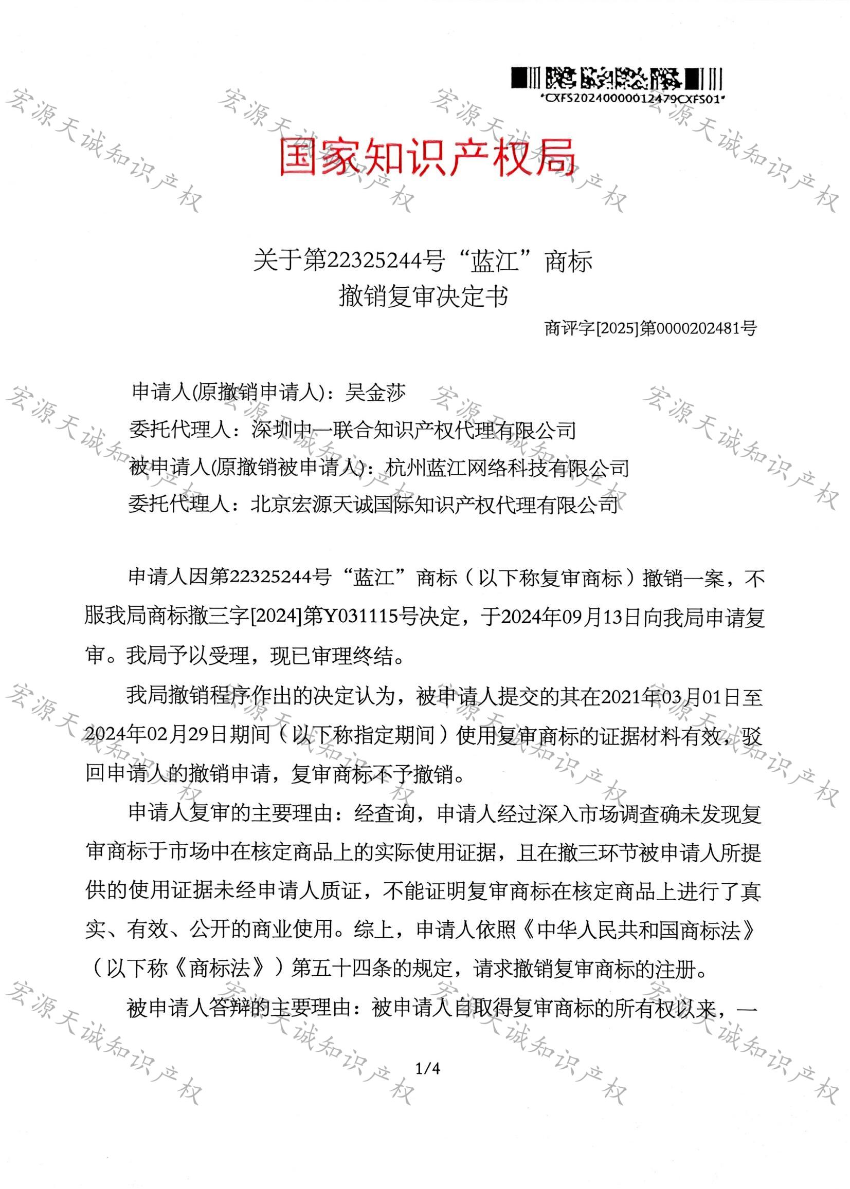 宏源天诚代理“蓝江”商标撤销复审答辩成功