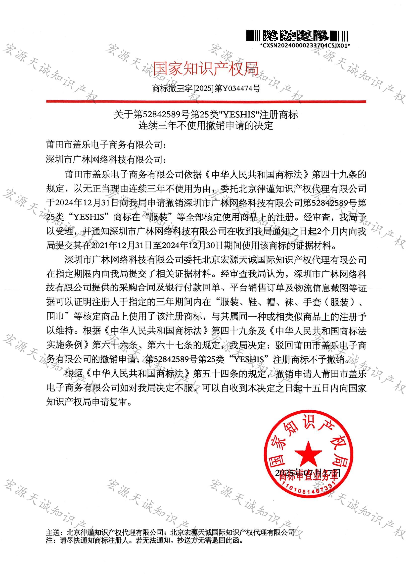 宏源天诚代理“YESHIS”商标撤三答辩成功