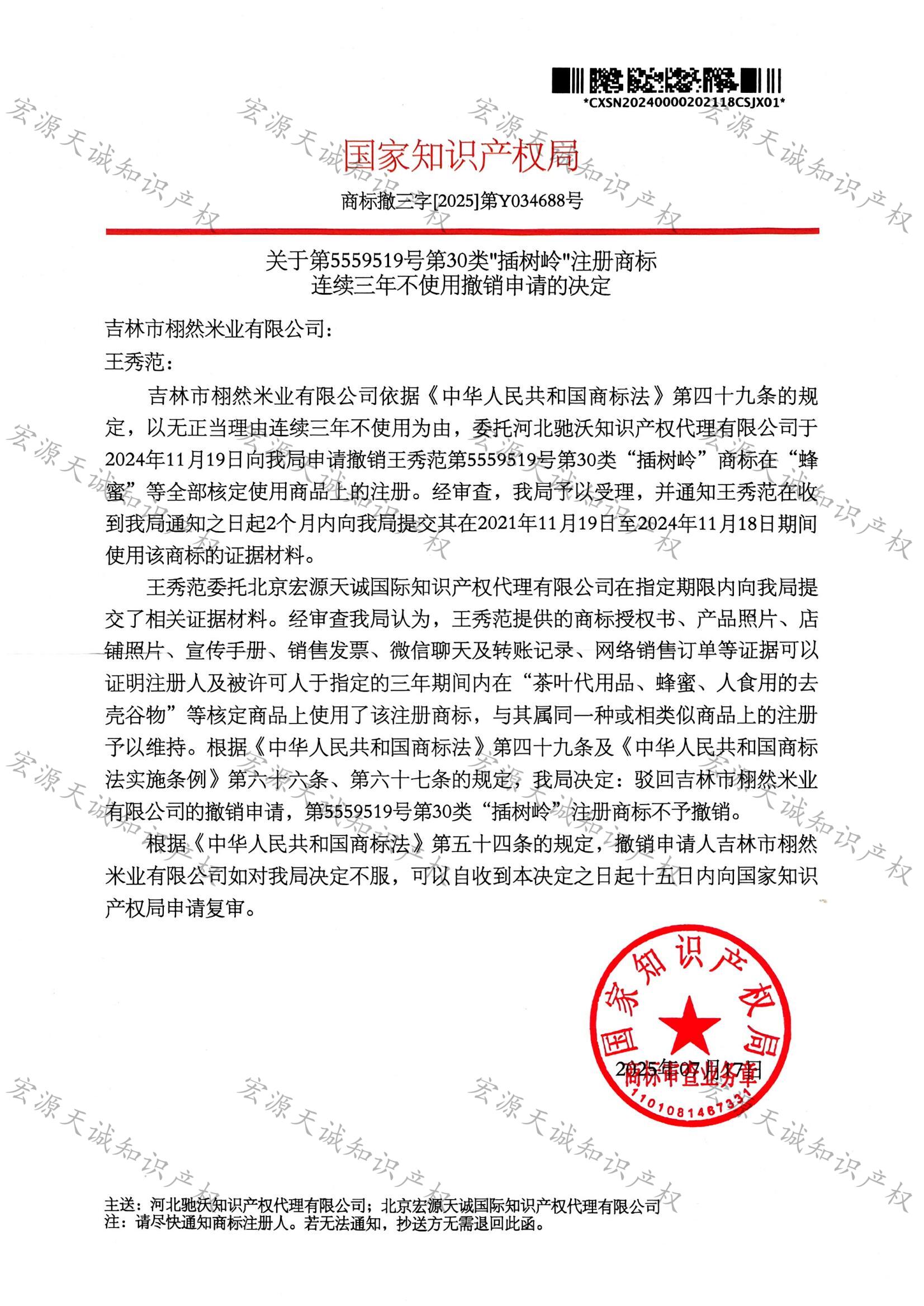 宏源天诚代理“插树岭”商标撤三答辩成功