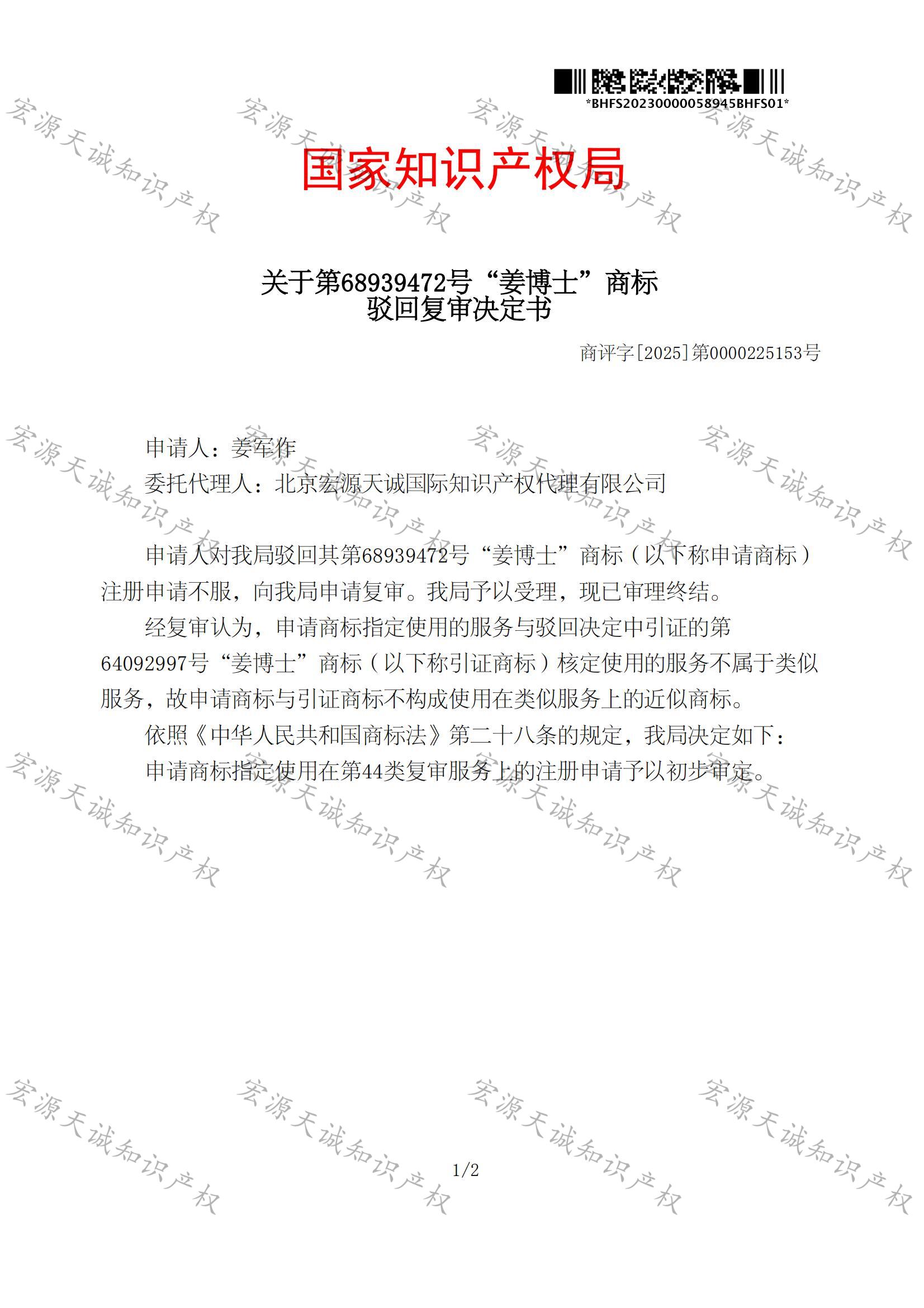 宏源天诚代理“姜博士”商标驳回复审成功