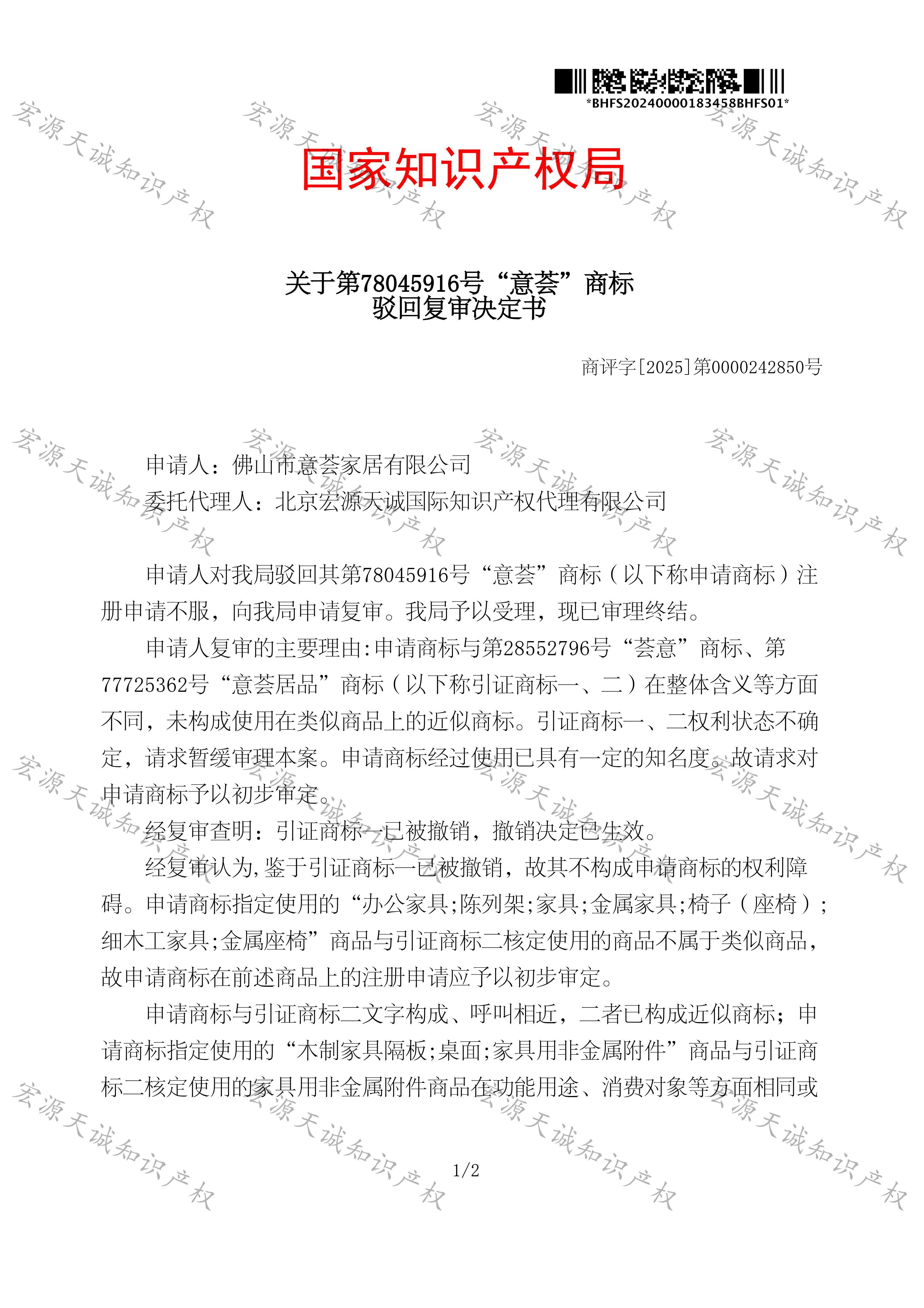 宏源天诚代理“意荟”商标驳回复审成功