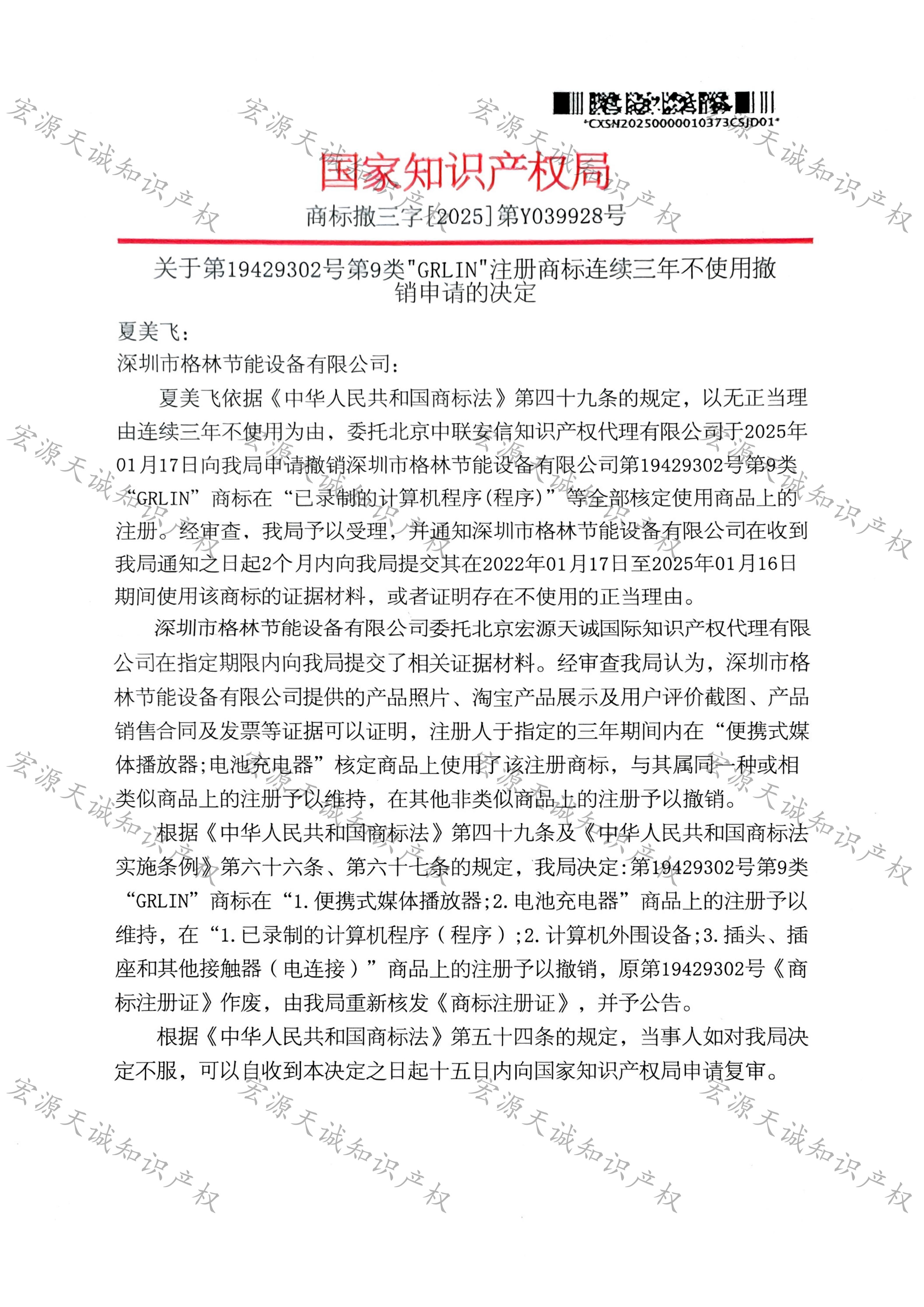 宏源天诚代理“GRLIN”商标撤三答辩成功