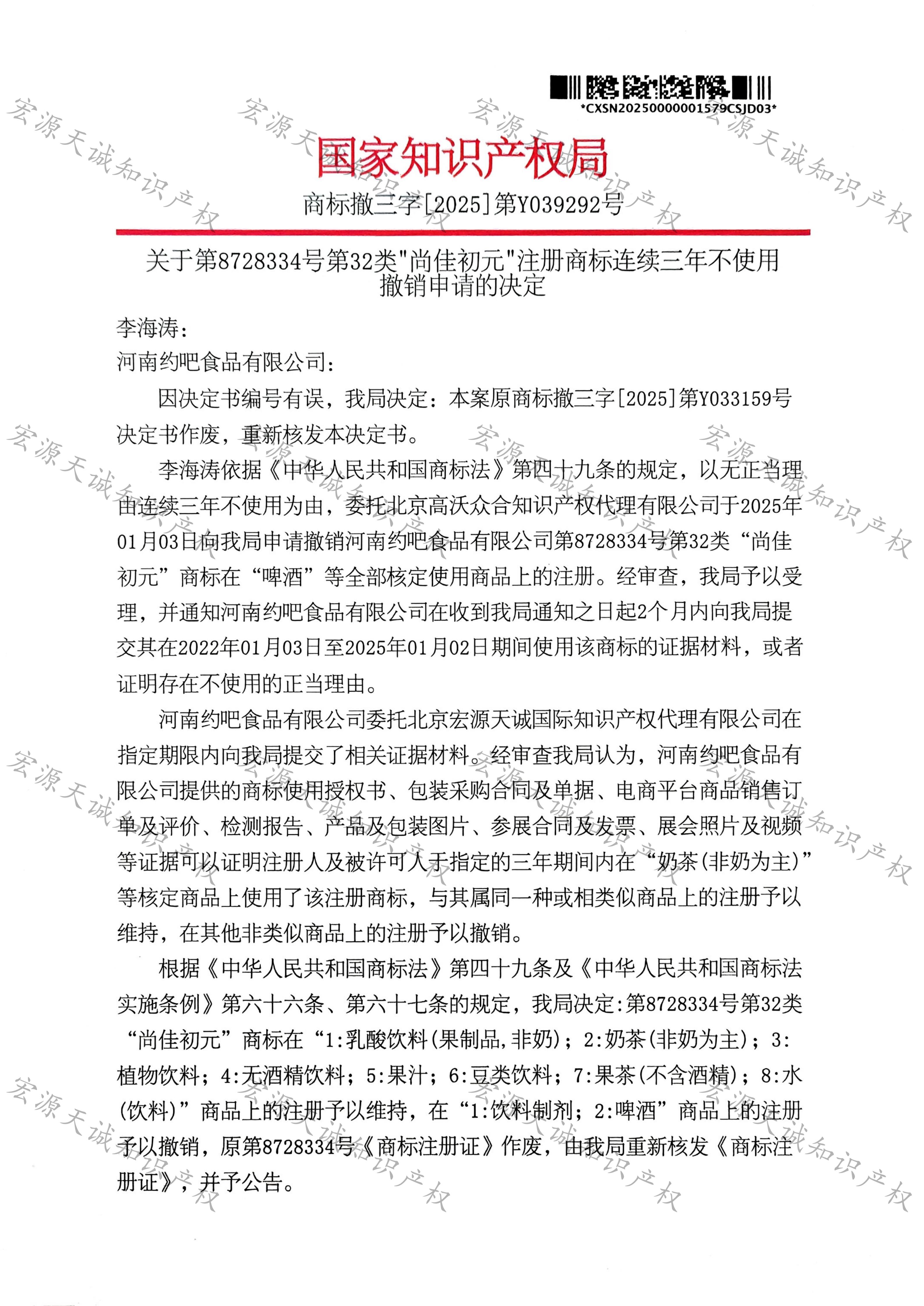 宏源天诚代理“尚佳初元”商标撤三答辩成功