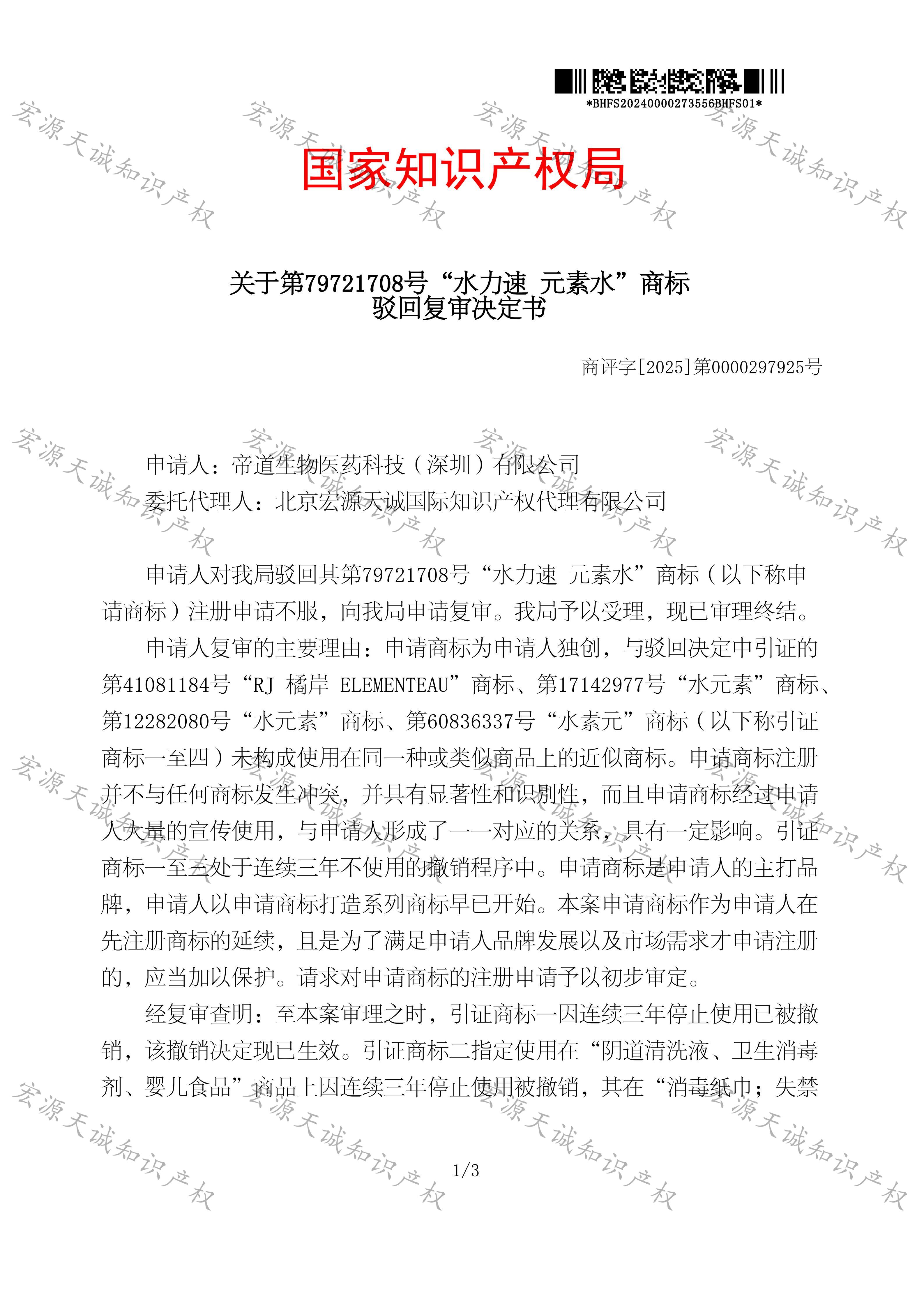 宏源天诚代理“水力速 元素水”商标驳回复审成功