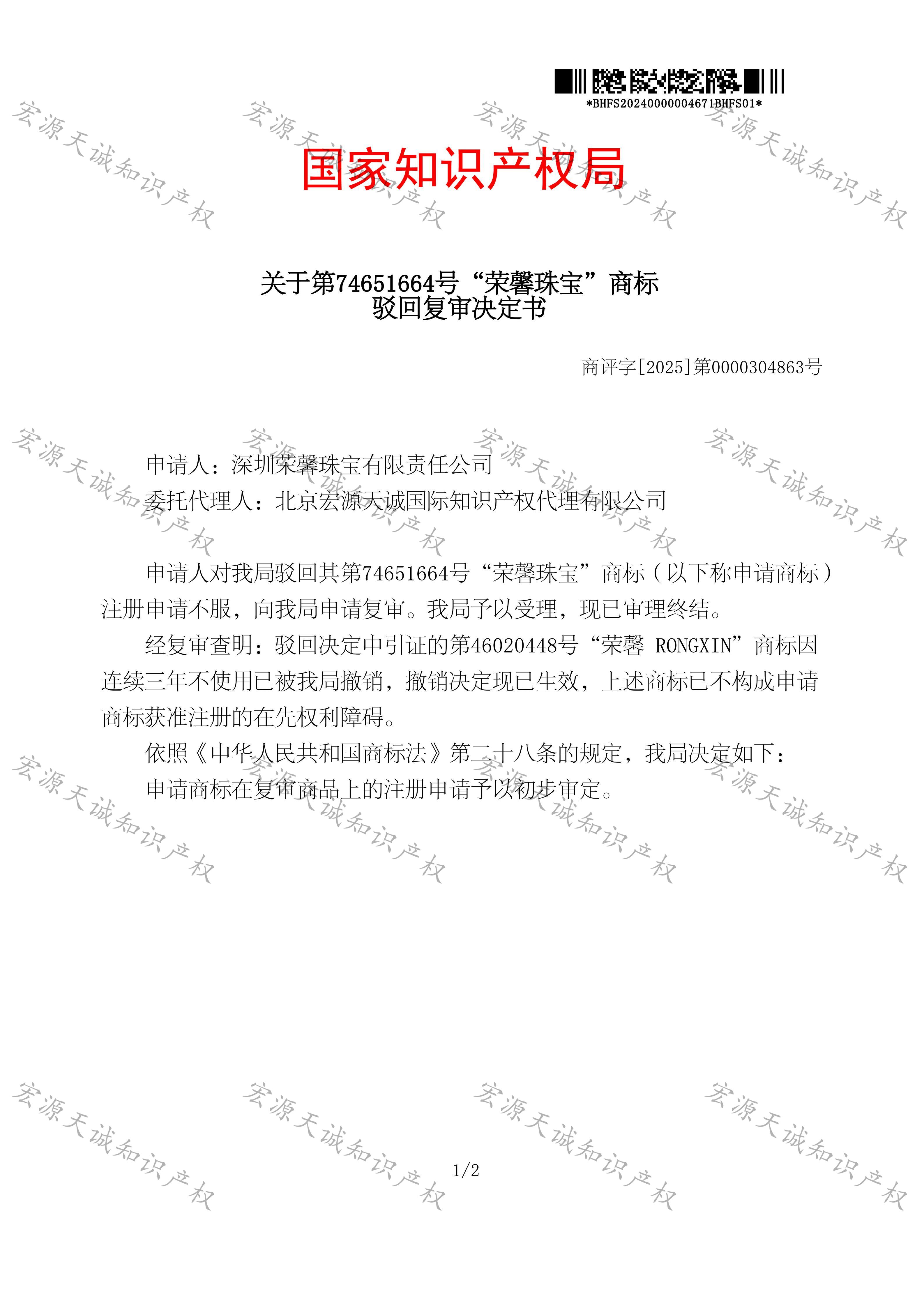宏源天诚代理“荣馨珠宝”商标驳回复审成功
