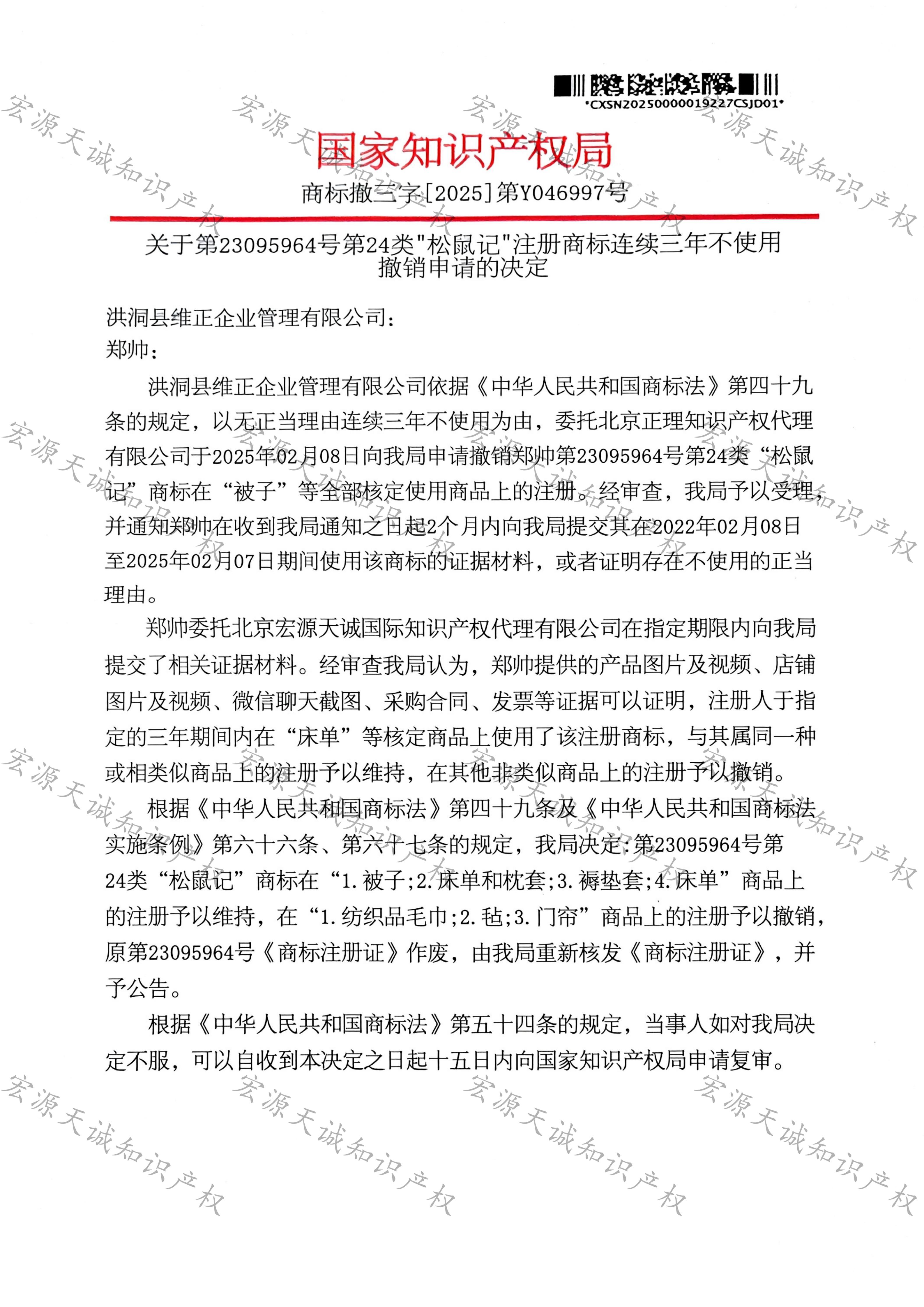 宏源天诚代理“松鼠记”商标撤三答辩成功
