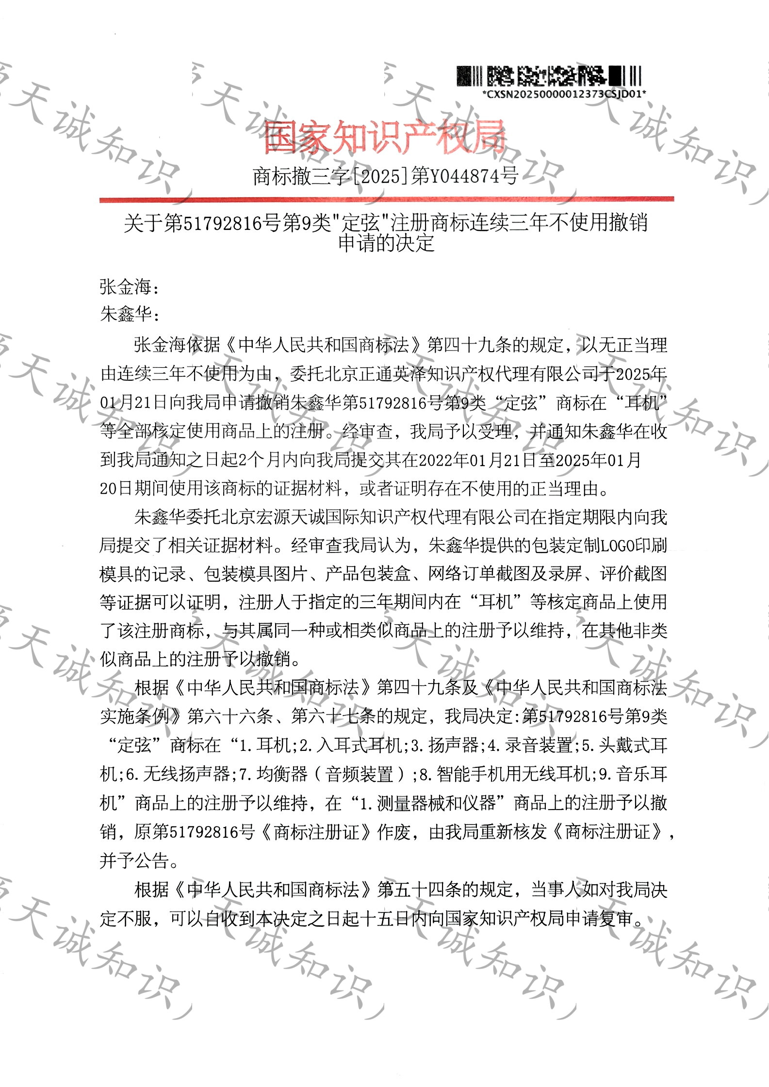 宏源天诚代理“定弦”商标撤三答辩成功