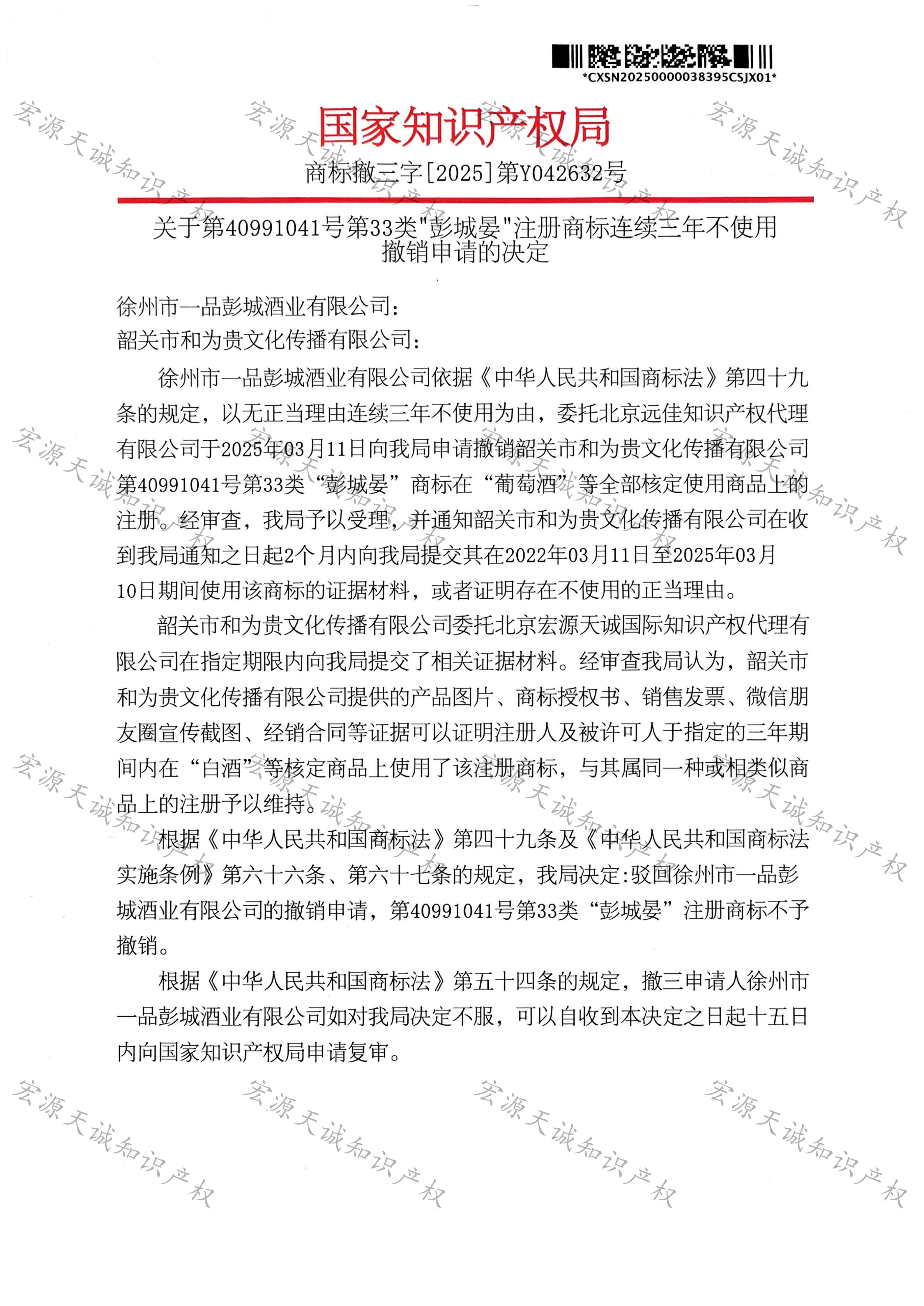 宏源天诚代理“彭城晏”商标撤三答辩成功