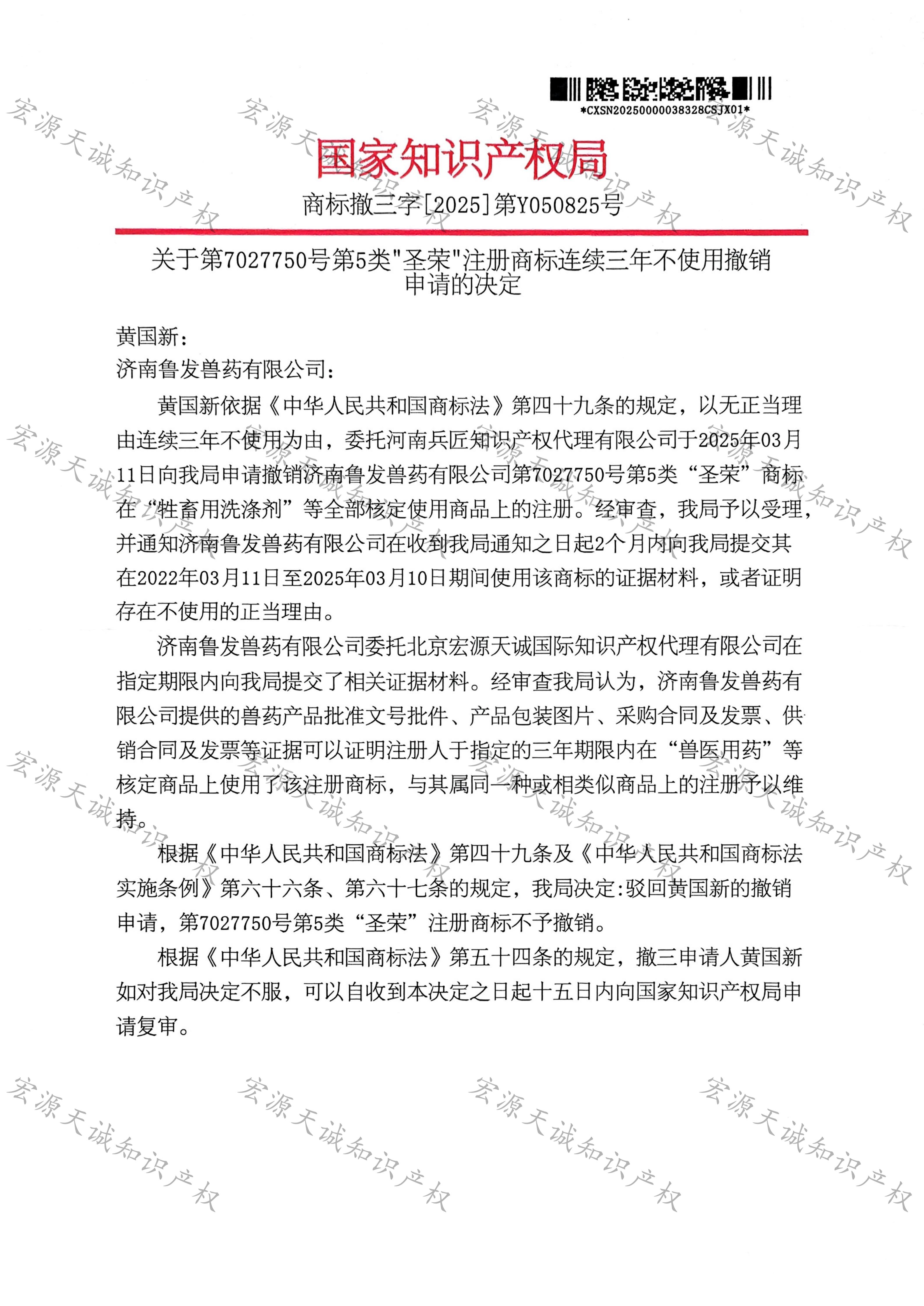 宏源天诚代理“圣荣”商标撤三答辩成功