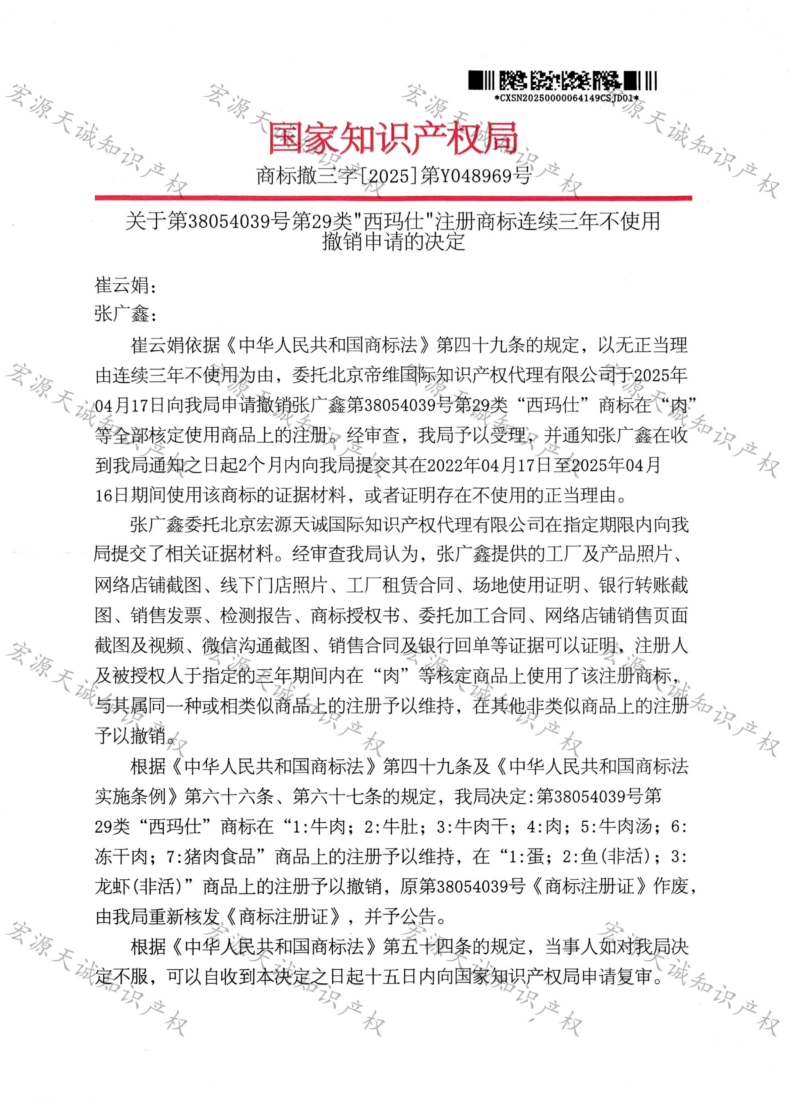 宏源天诚代理“西玛仕”商标撤三答辩成功