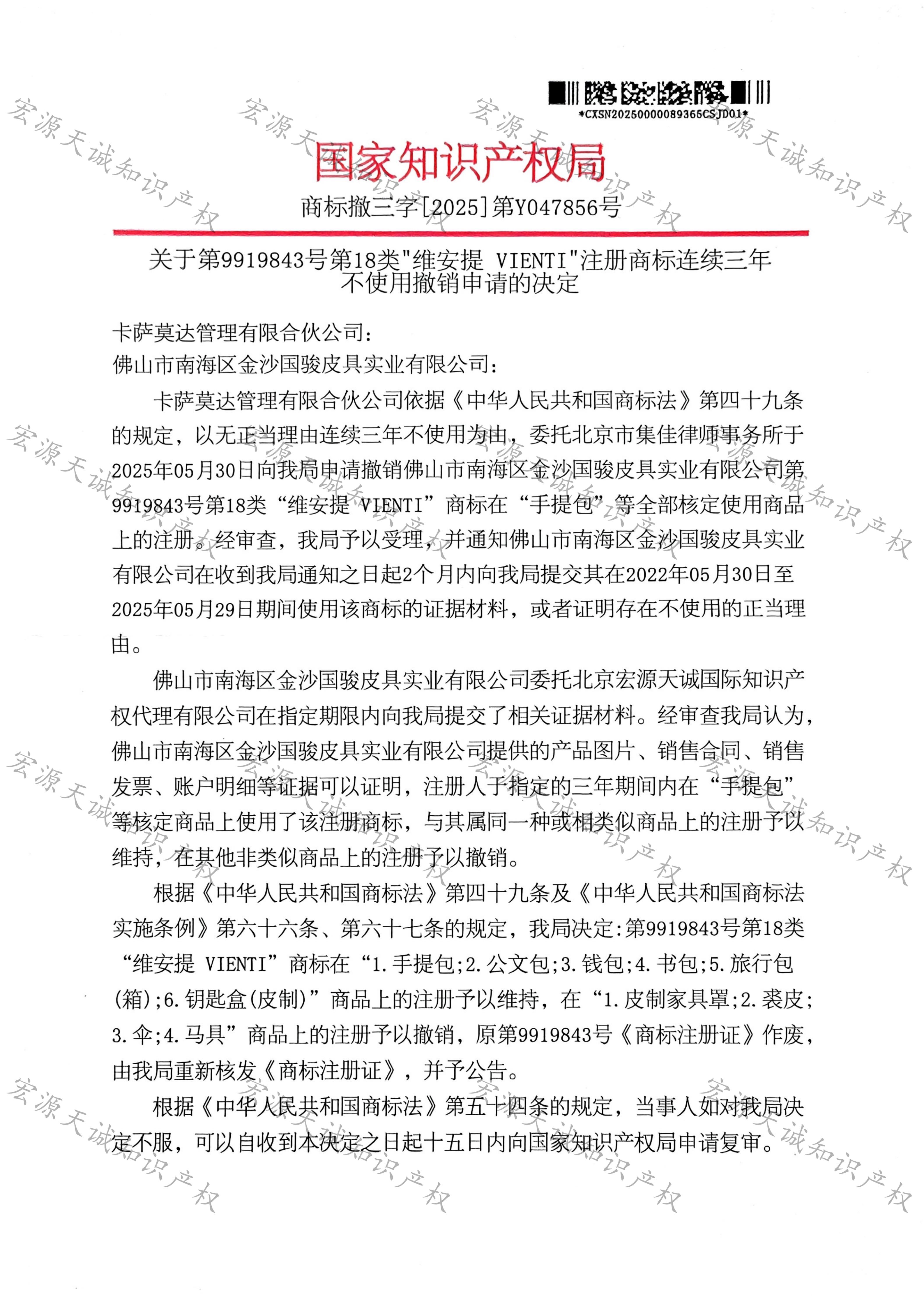 宏源天诚代理“维安提 VIENTI”商标撤三答辩成功