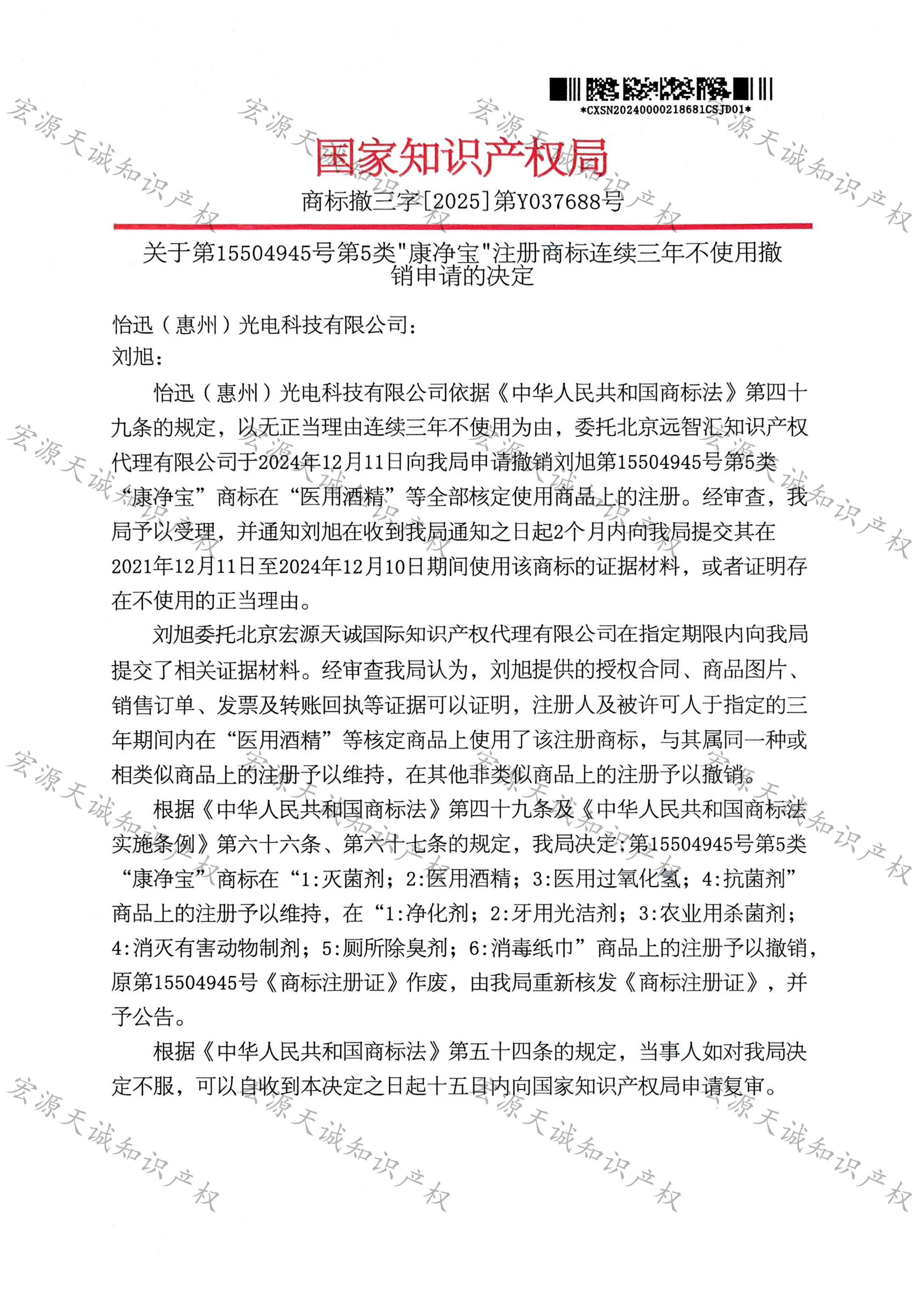宏源天诚代理“康净宝”商标撤三答辩成功