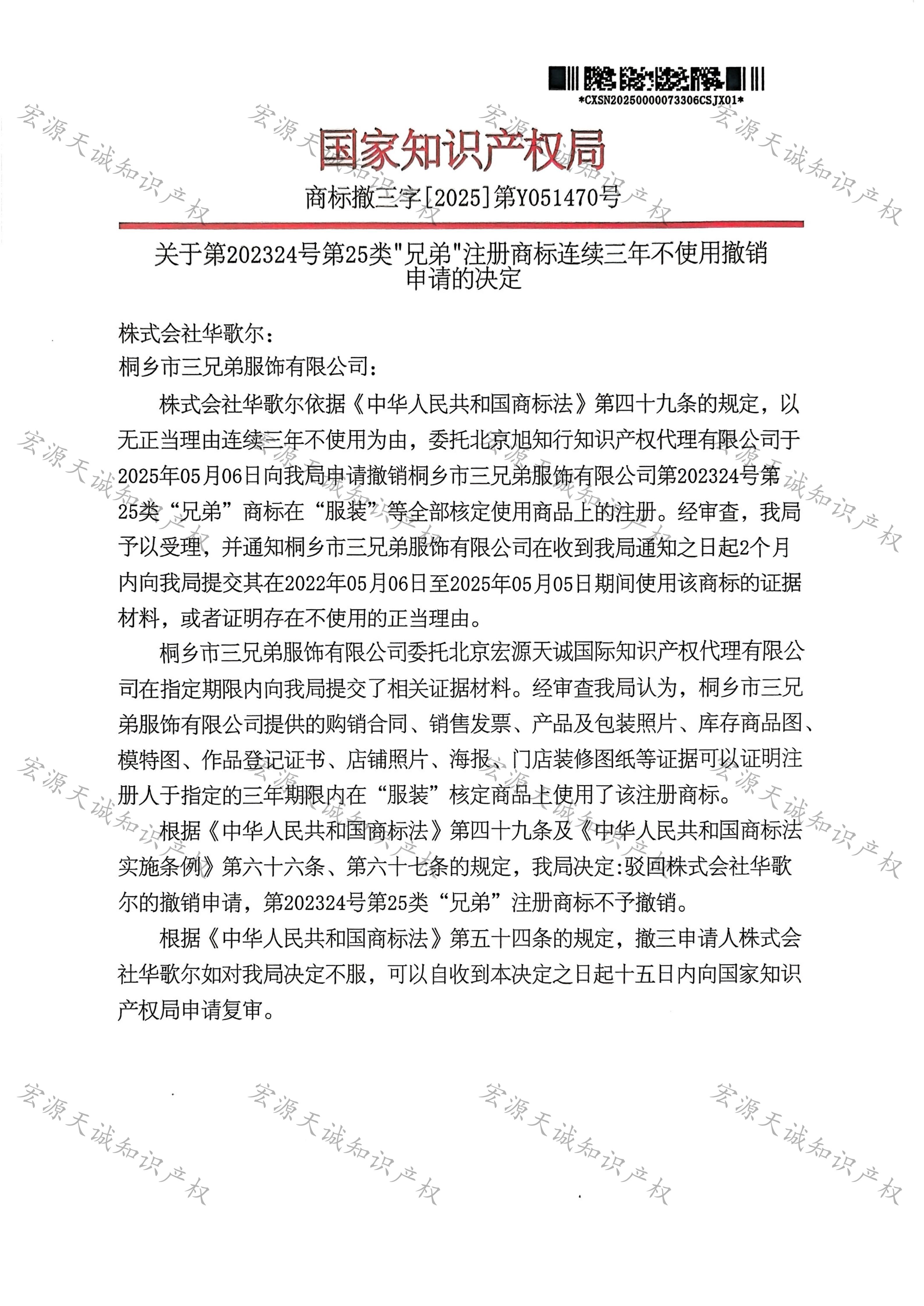 宏源天诚代理“兄弟”商标撤三答辩成功
