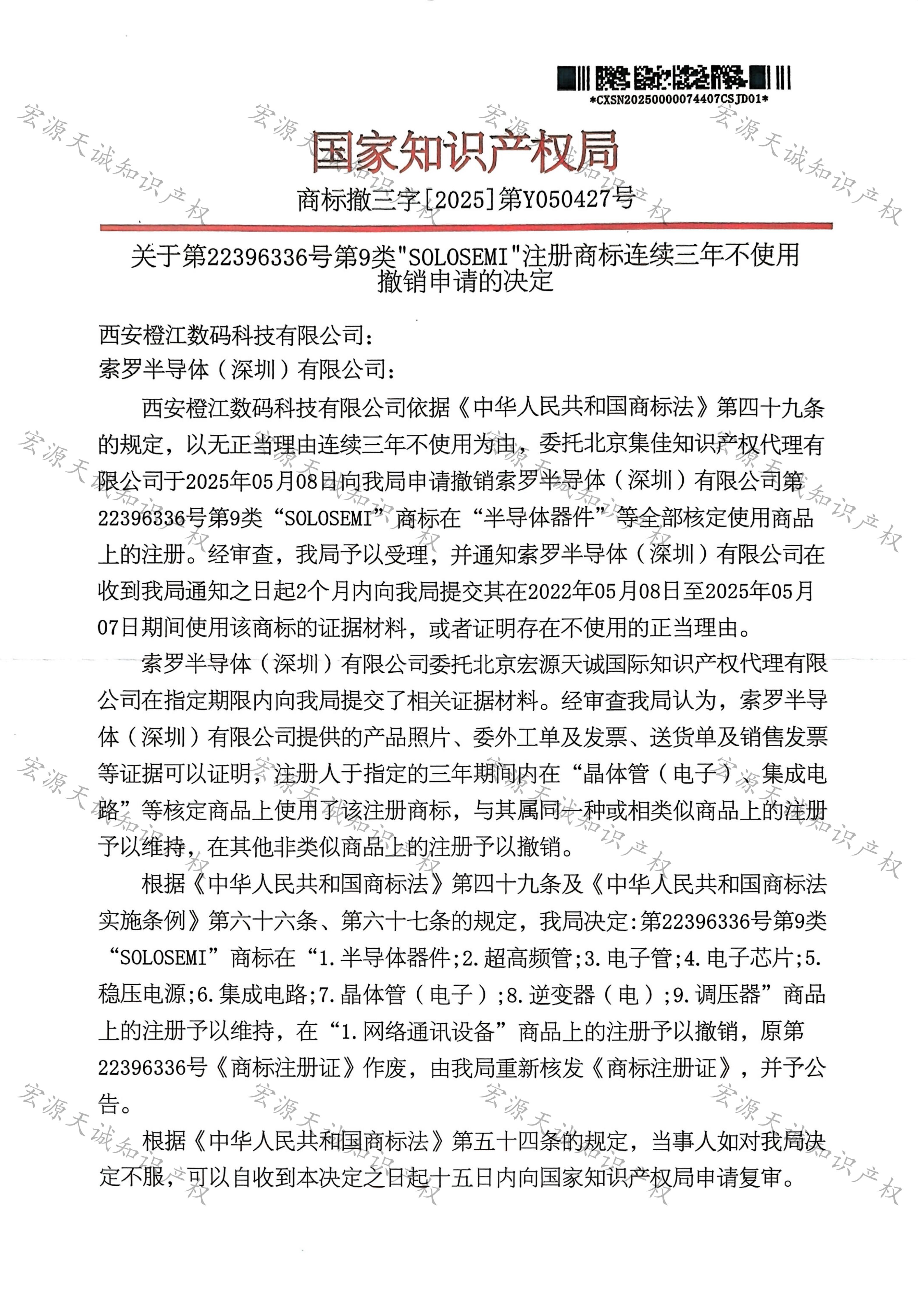 宏源天诚代理“SOLOSEMI”商标撤三答辩成功
