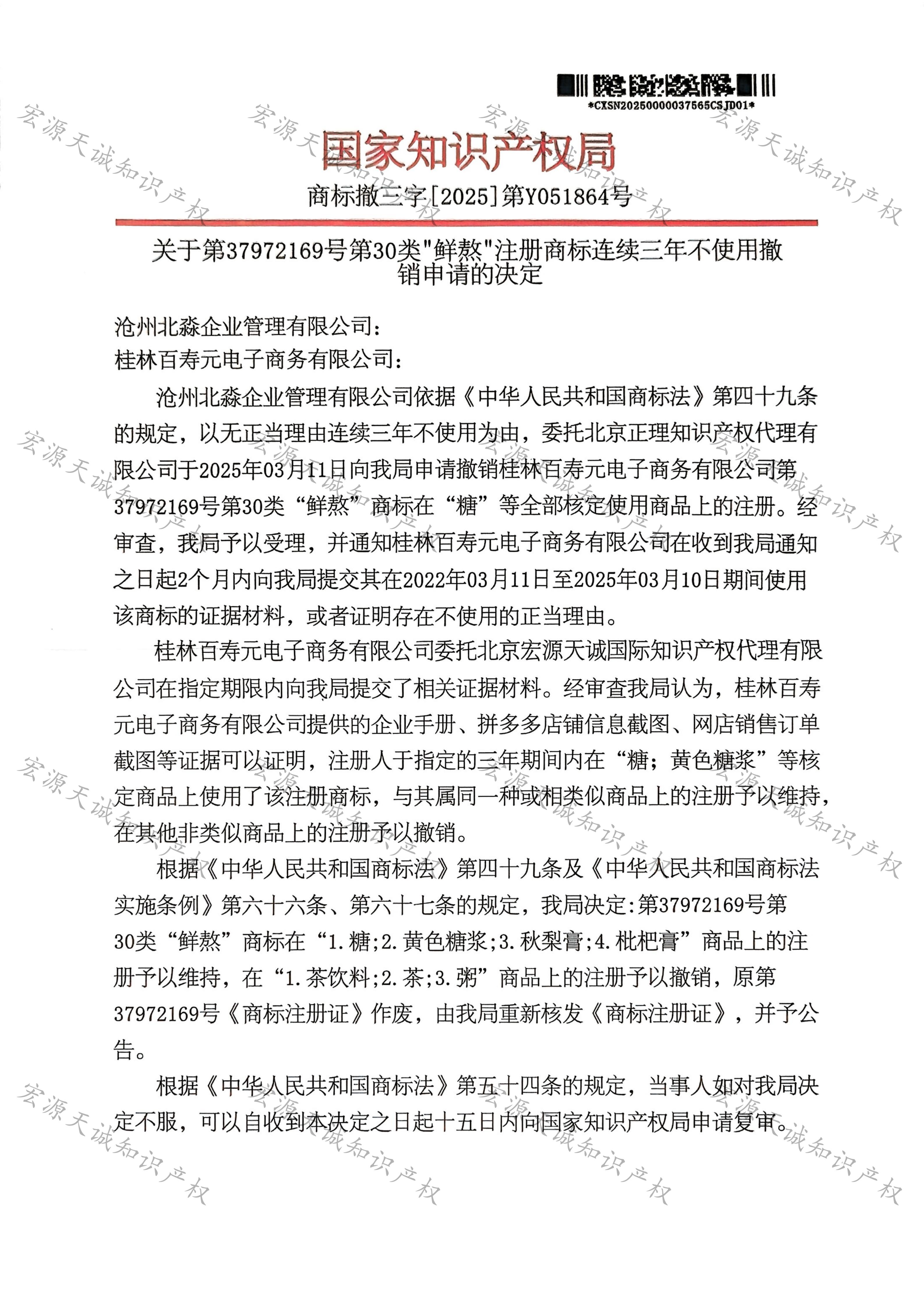 宏源天诚代理“鲜熬”商标撤三答辩成功