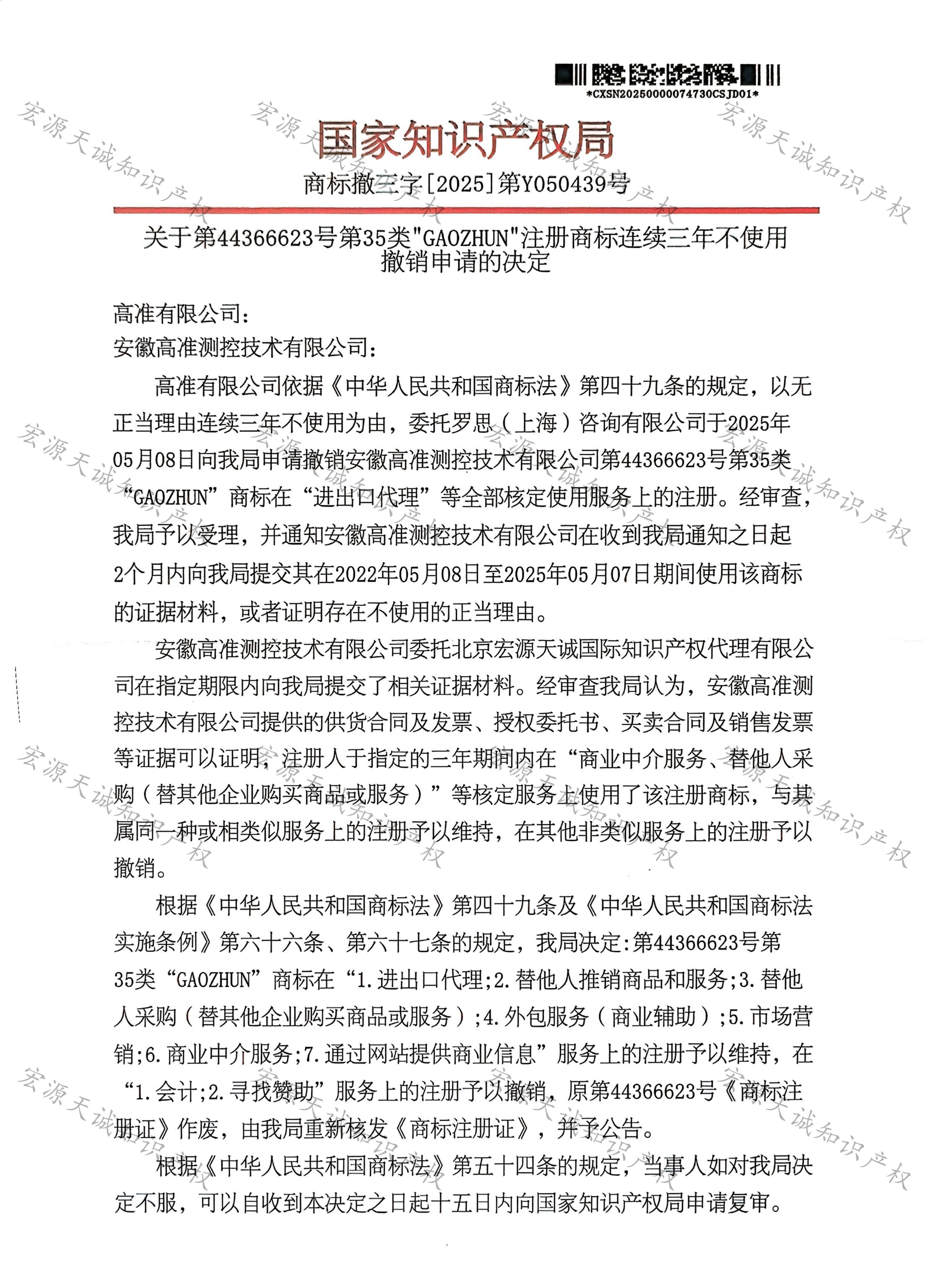 宏源天诚代理“GAOZHUN”商标撤三答辩成功