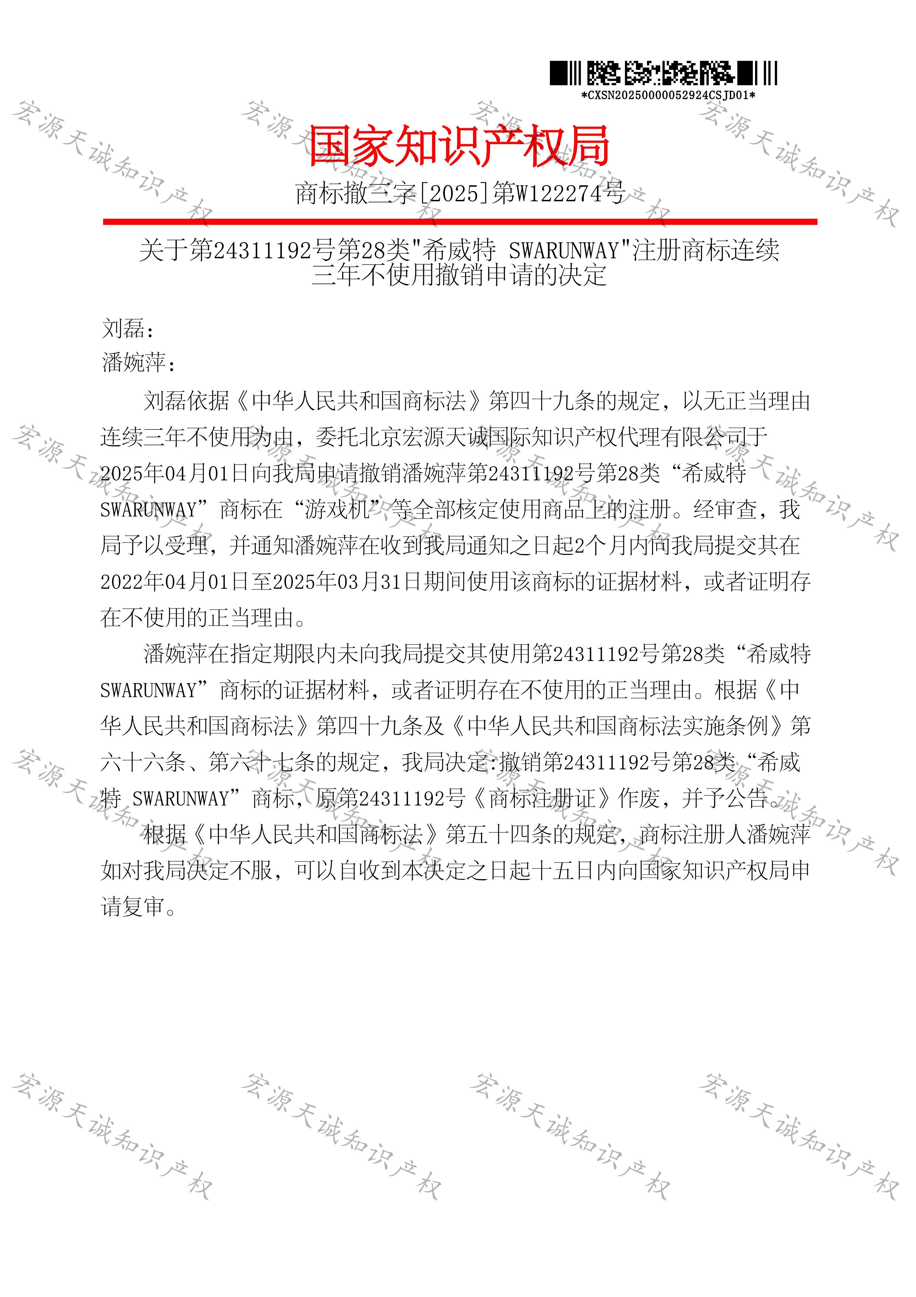 宏源天诚代理“希威特 SWARUNWAY”商标提撤三成功