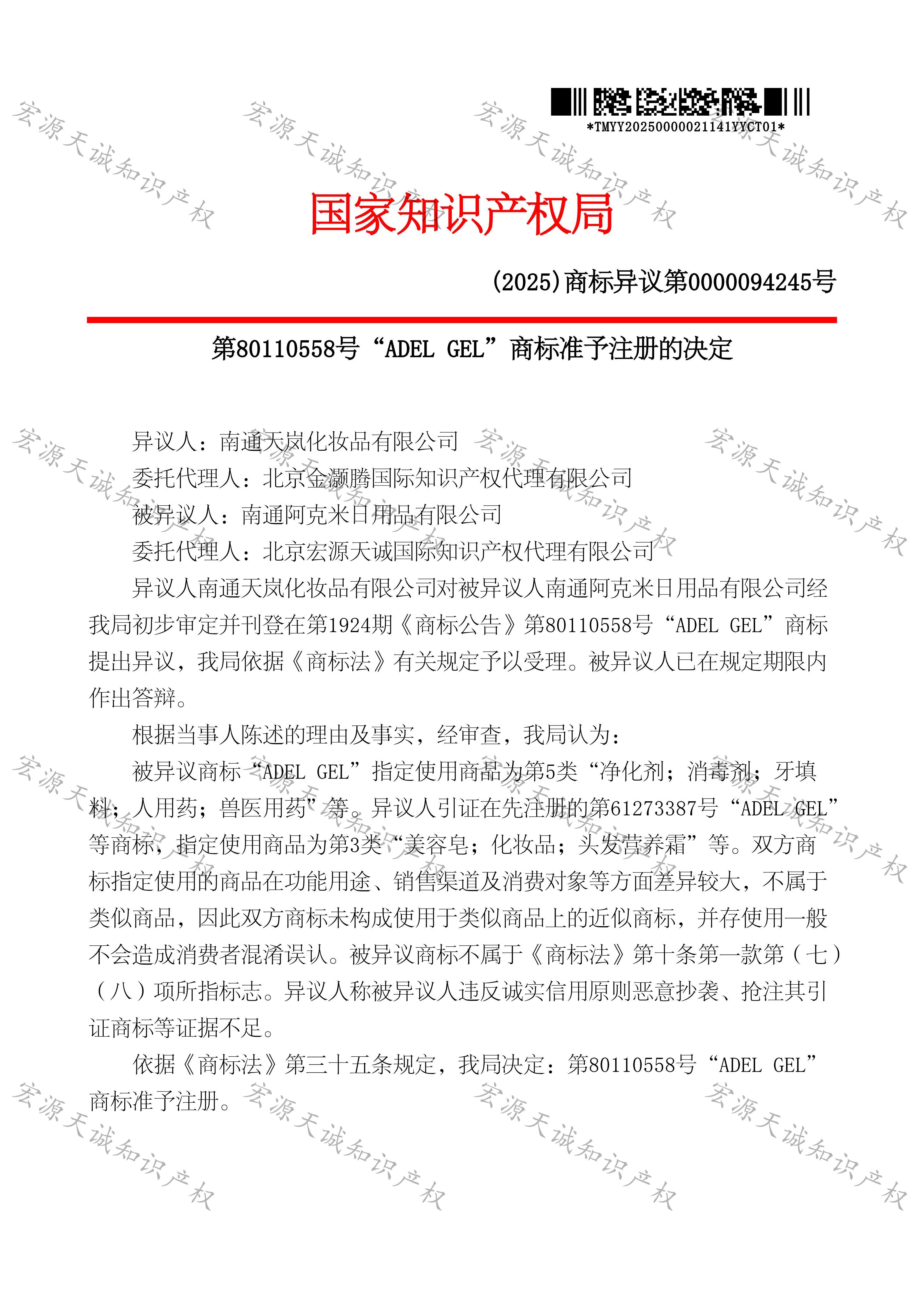 宏源天诚代理“ADEL GEL”商标异议答辩成功