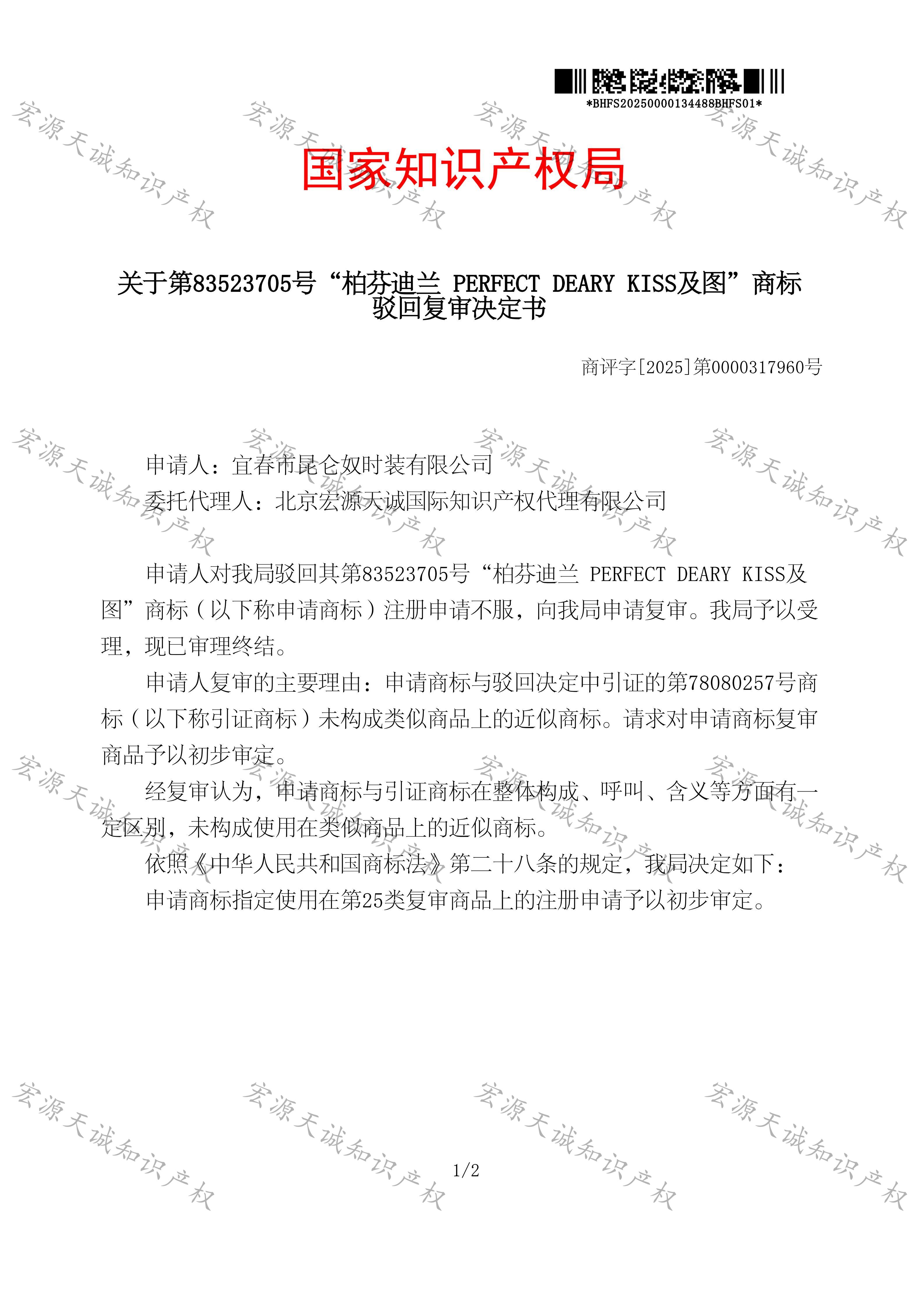 宏源天诚代理“柏芬迪兰 PERFECT DEARY KISS”商标驳回复审成功
