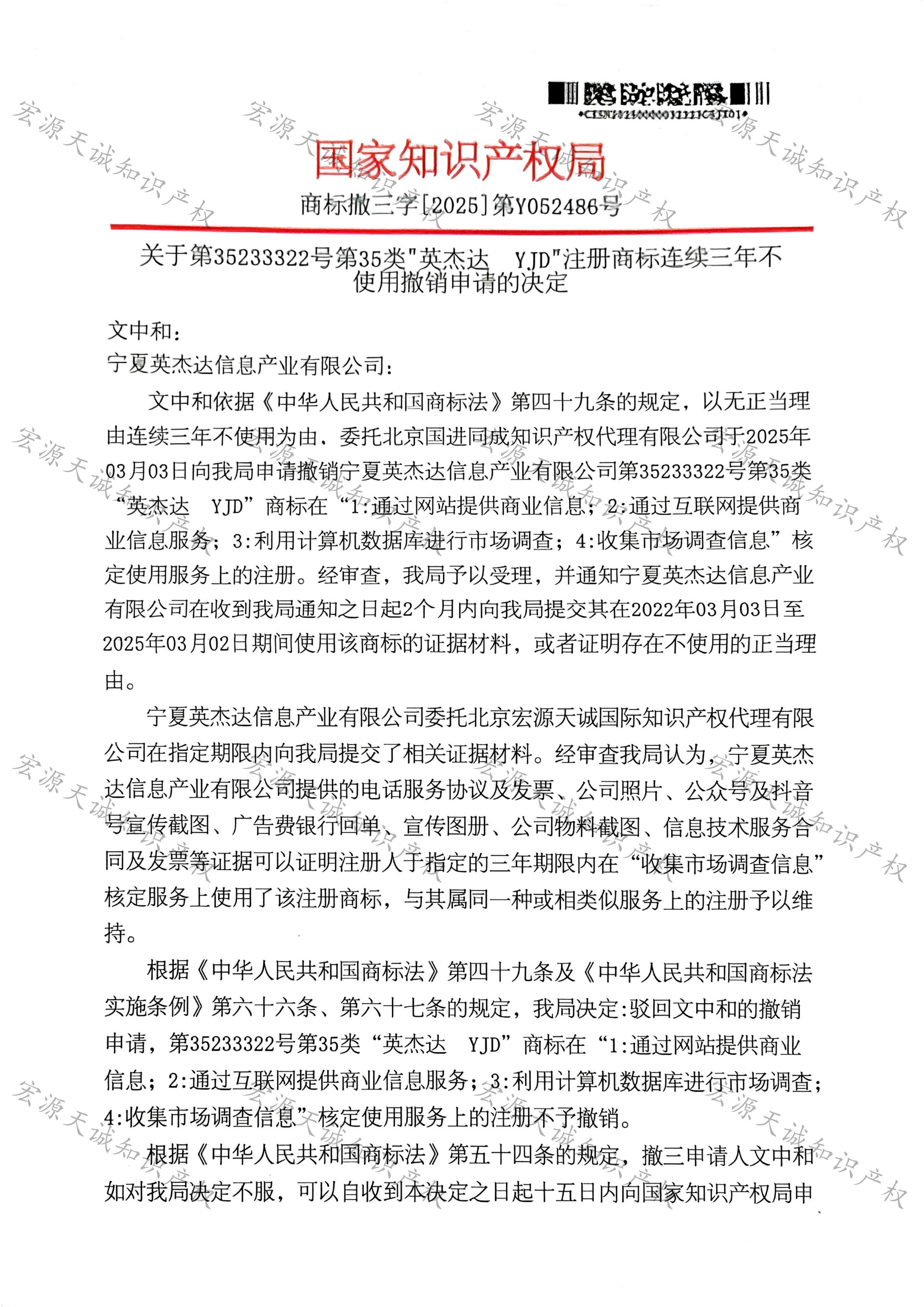 宏源天诚代理“英杰达 YJD”商标撤三答辩成功