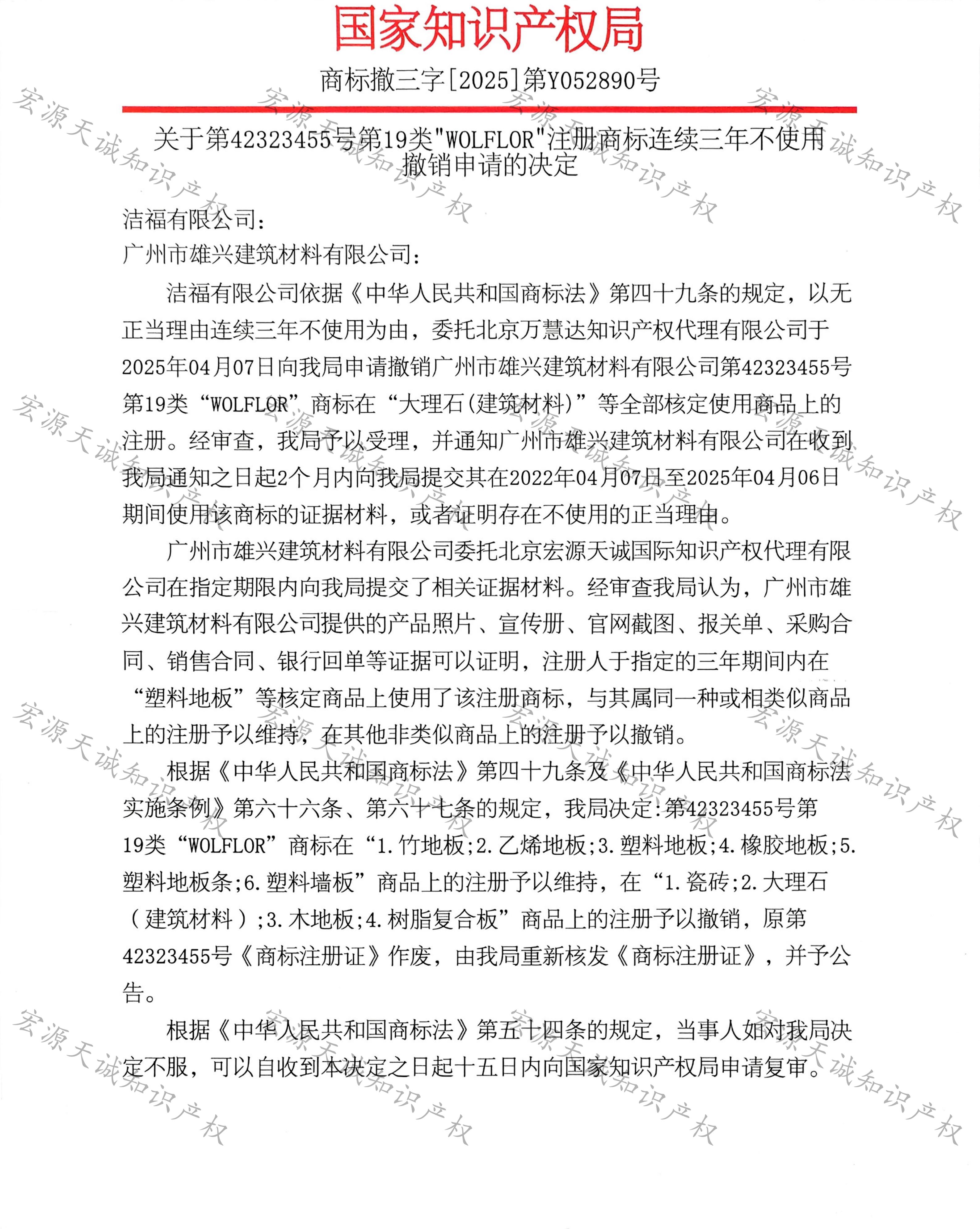 宏源天诚代理“WOLFLOR”商标撤三答辩成功