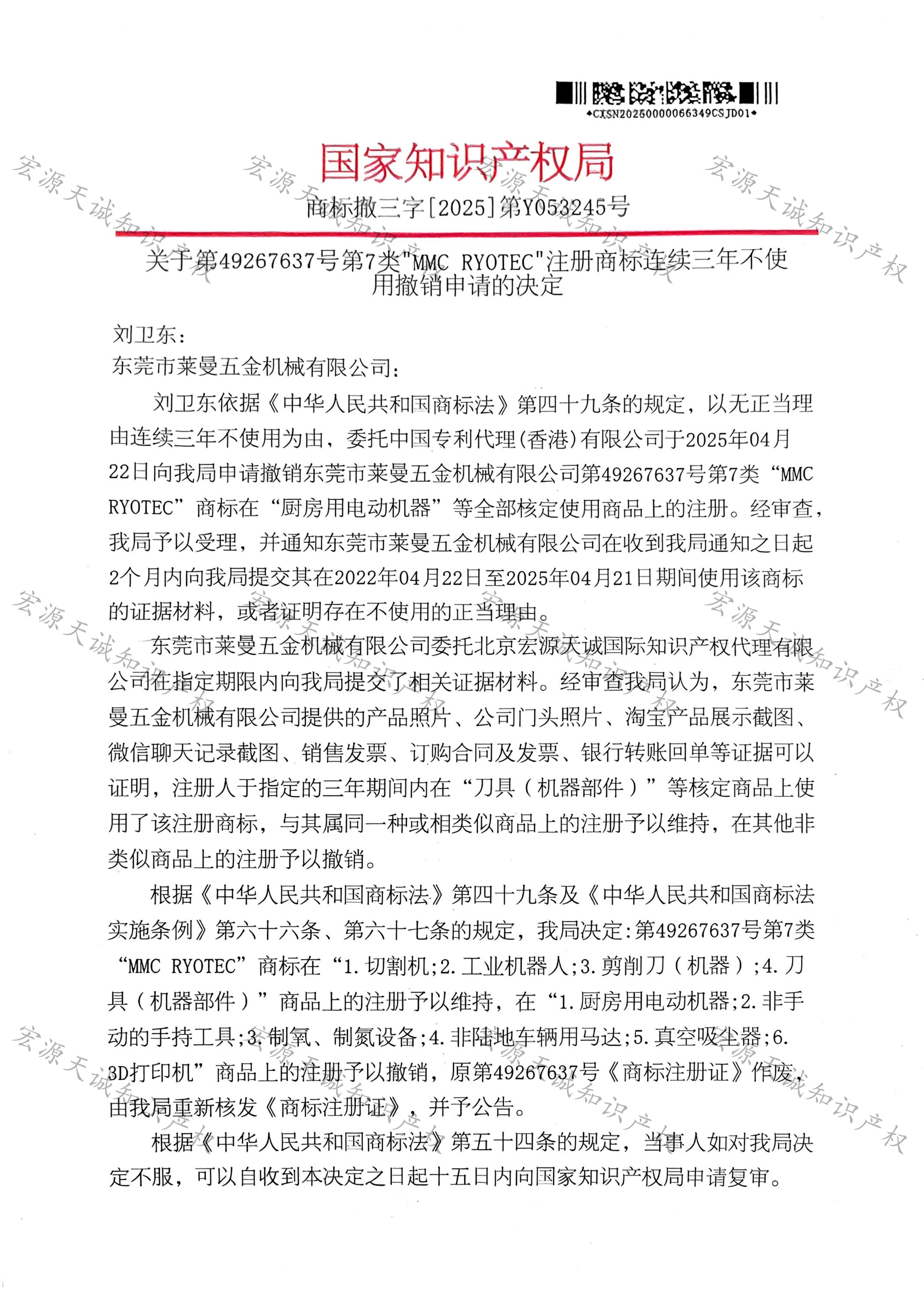 宏源天诚代理“MMC RYOTEC”商标撤三答辩成功