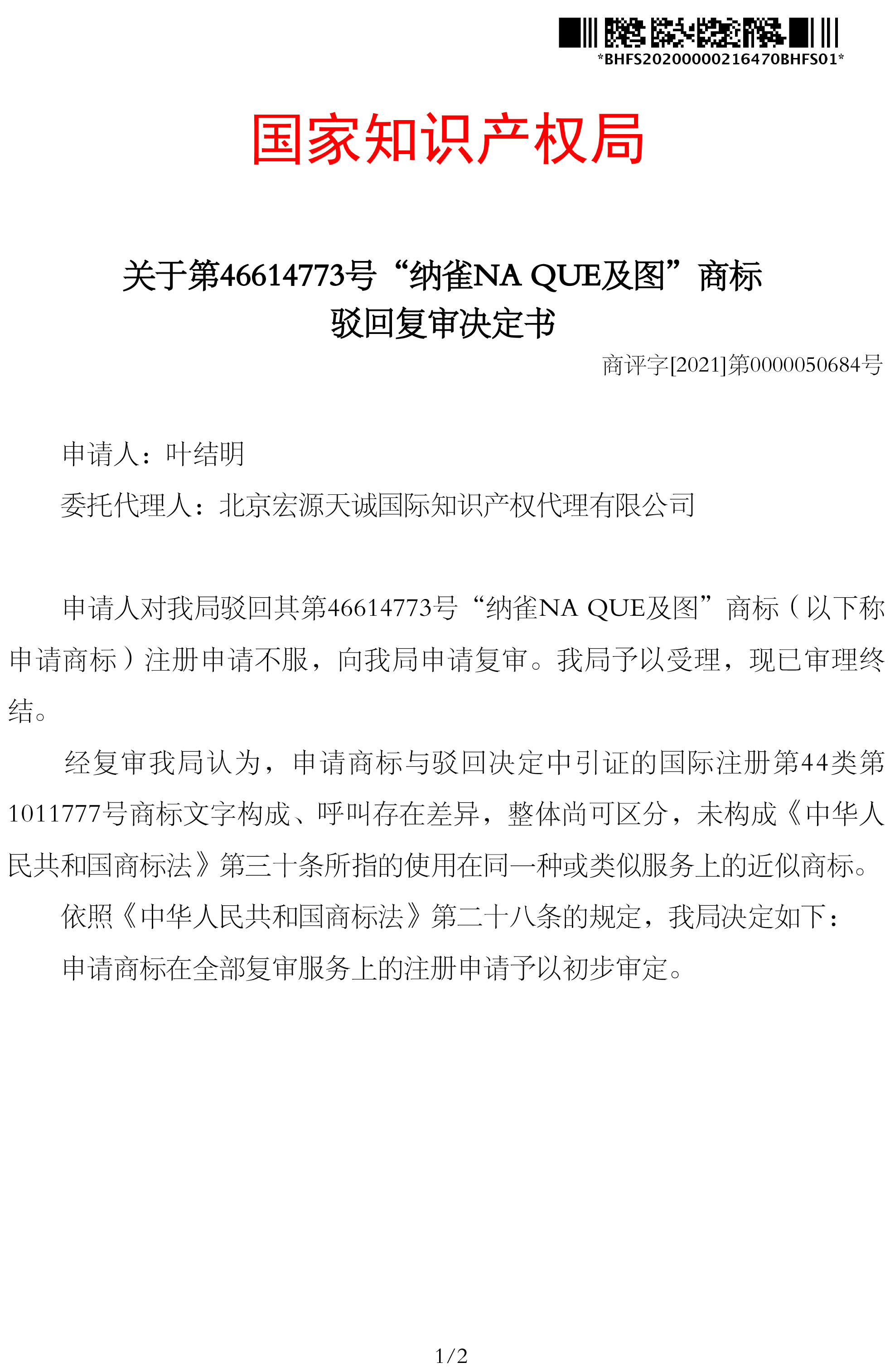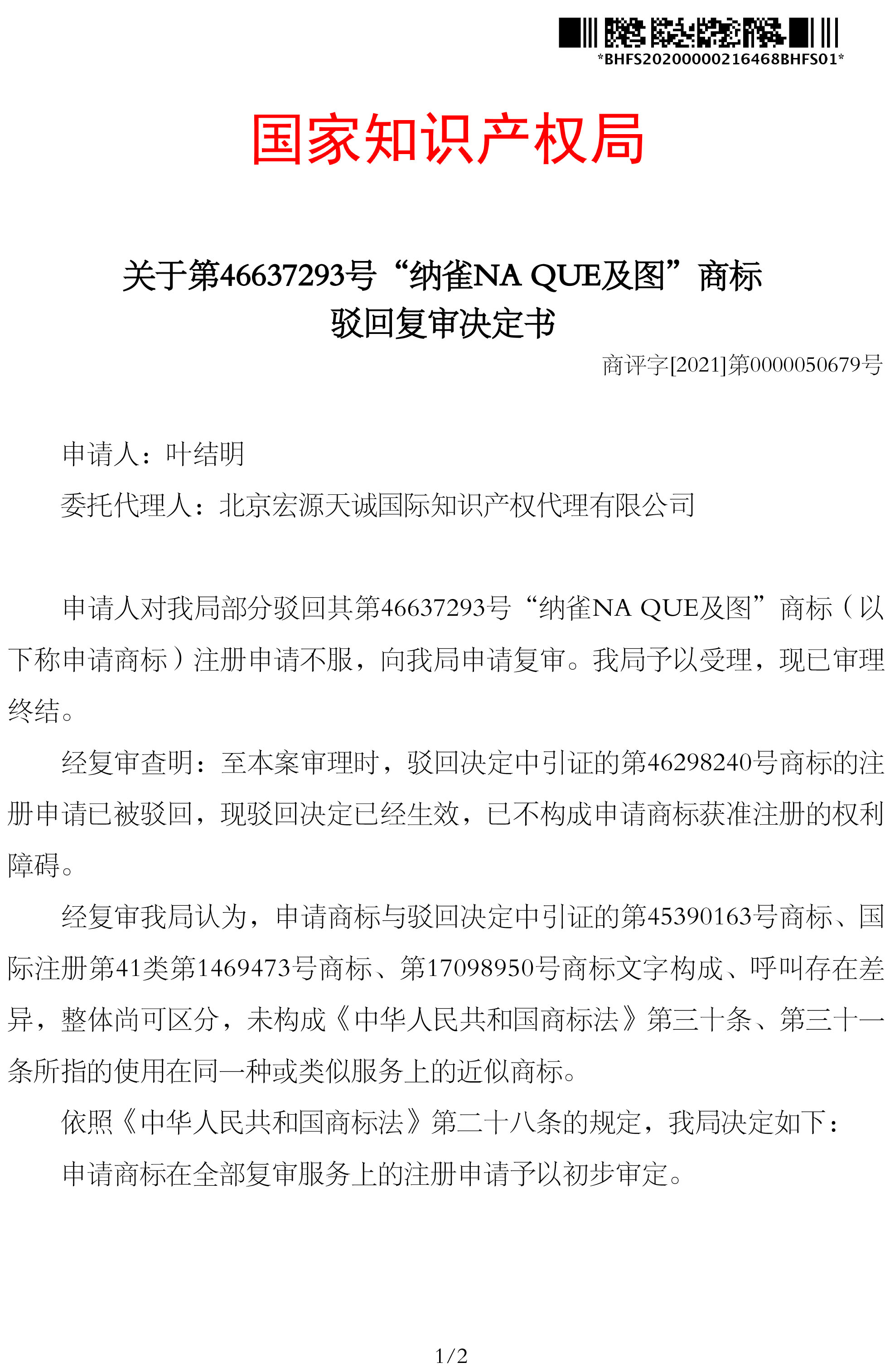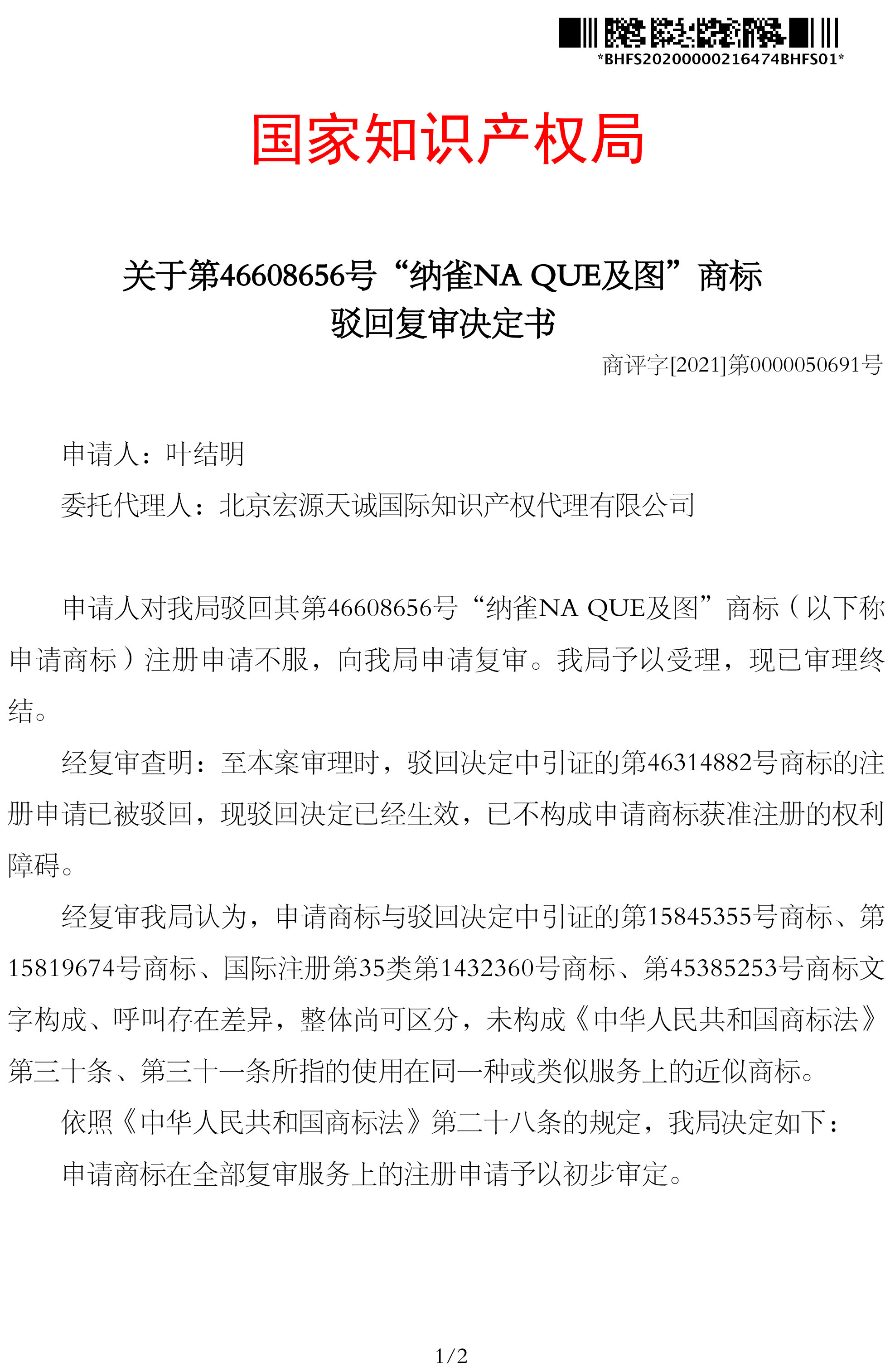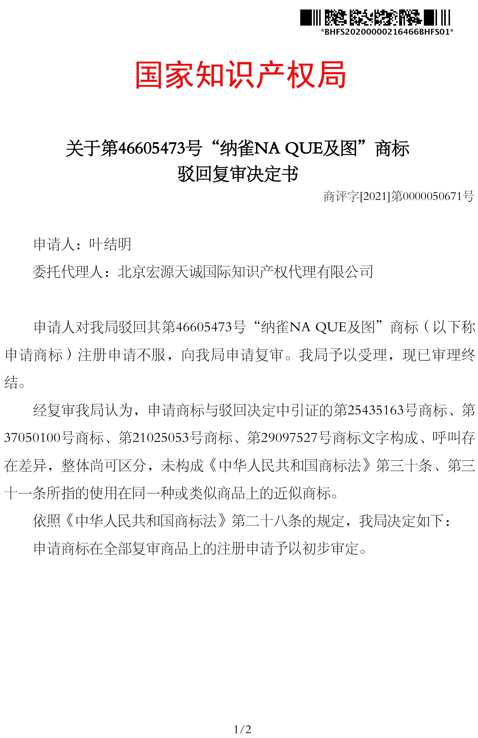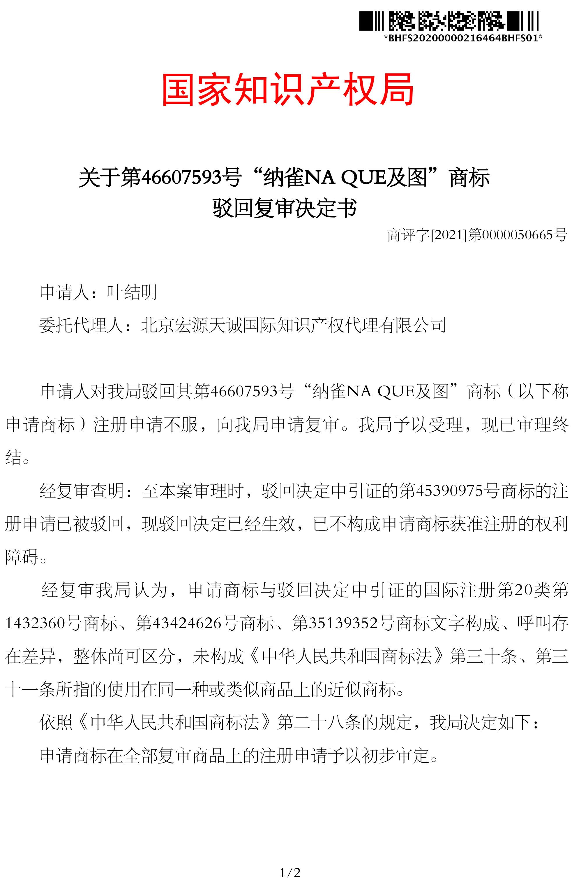 宏源天诚代理“纳雀NA QUE及图”等10个类别商标驳回复审成功