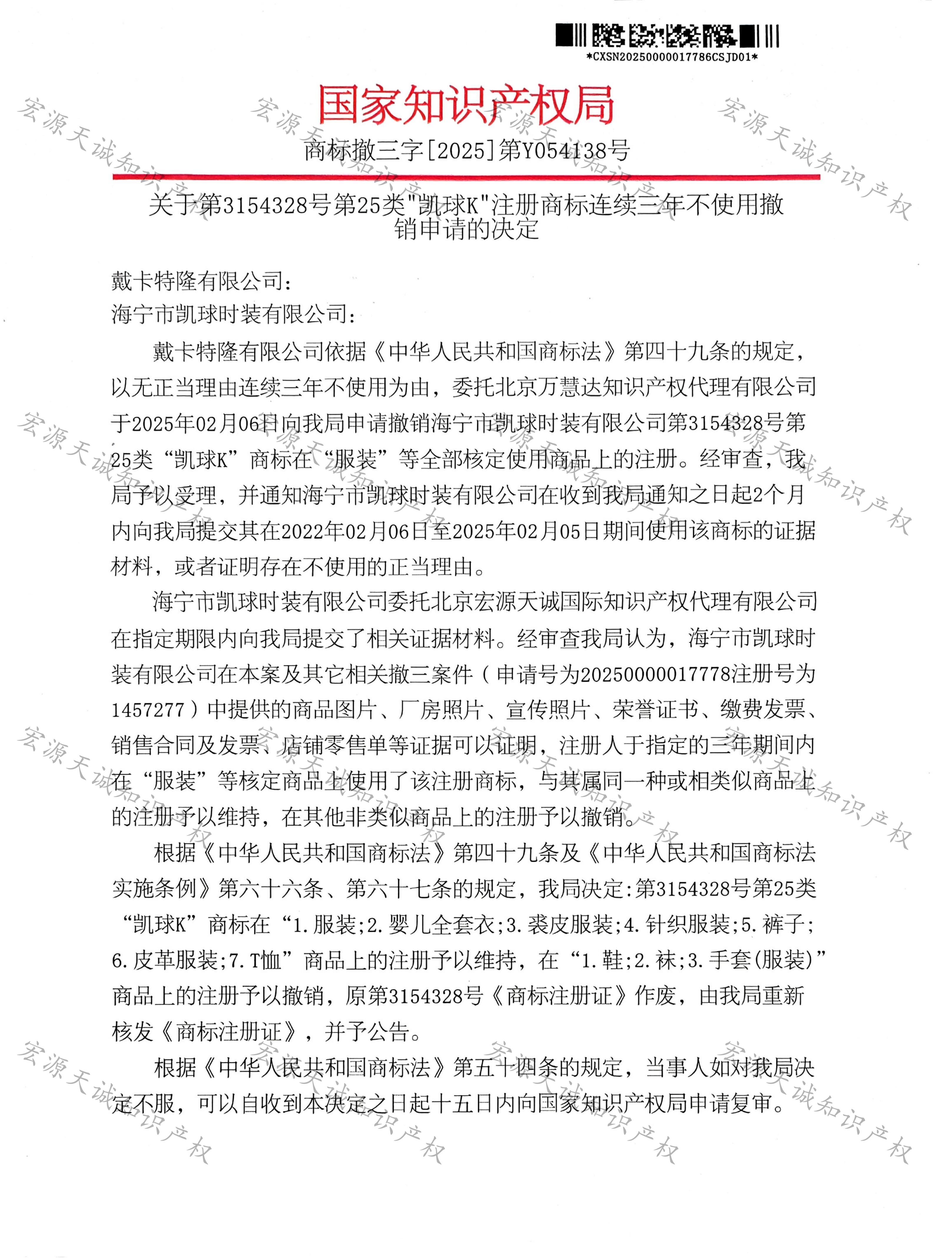 宏源天诚代理“凯球K”商标撤三答辩成功