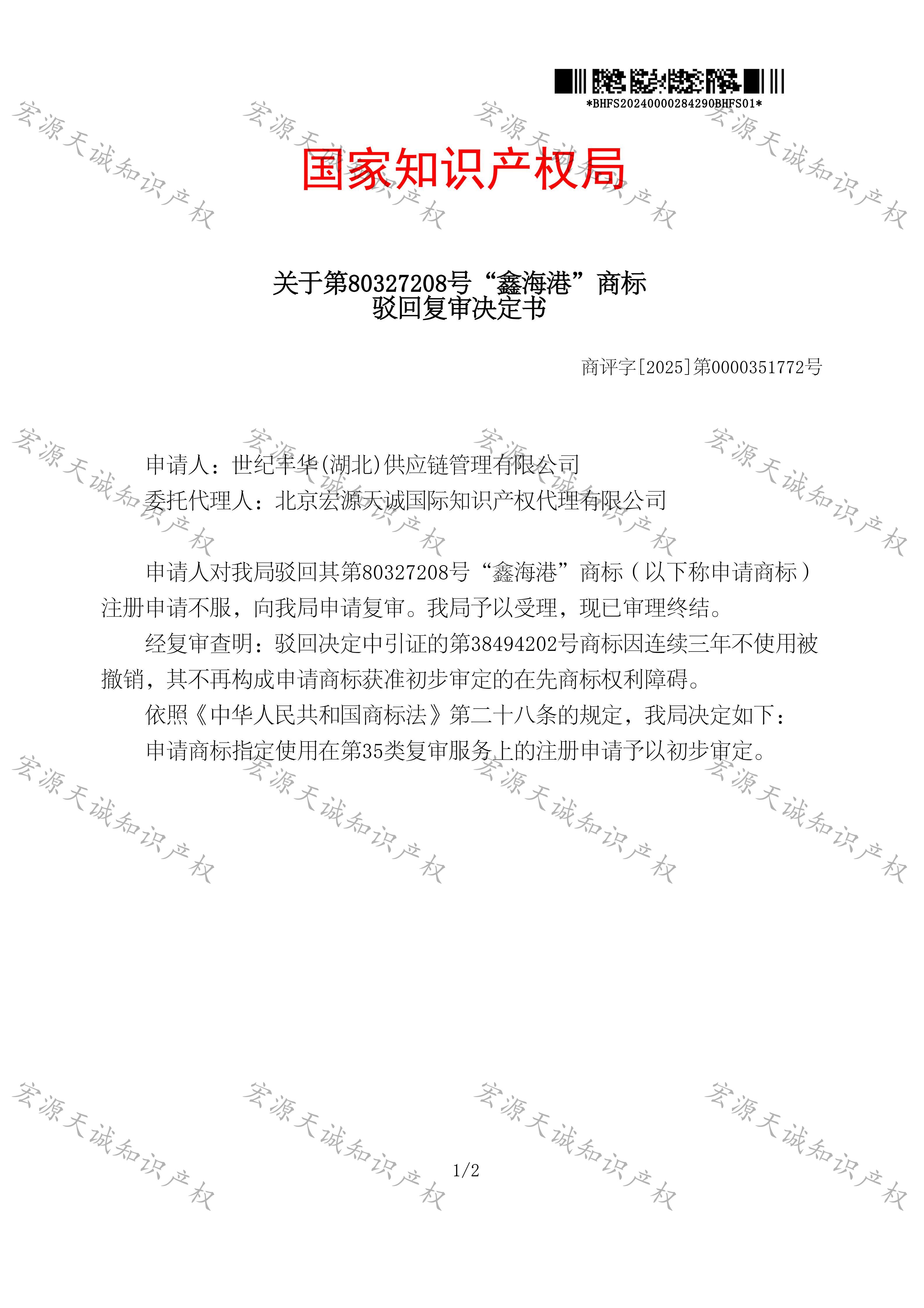 宏源天诚代理“鑫海港”商标驳回复审成功