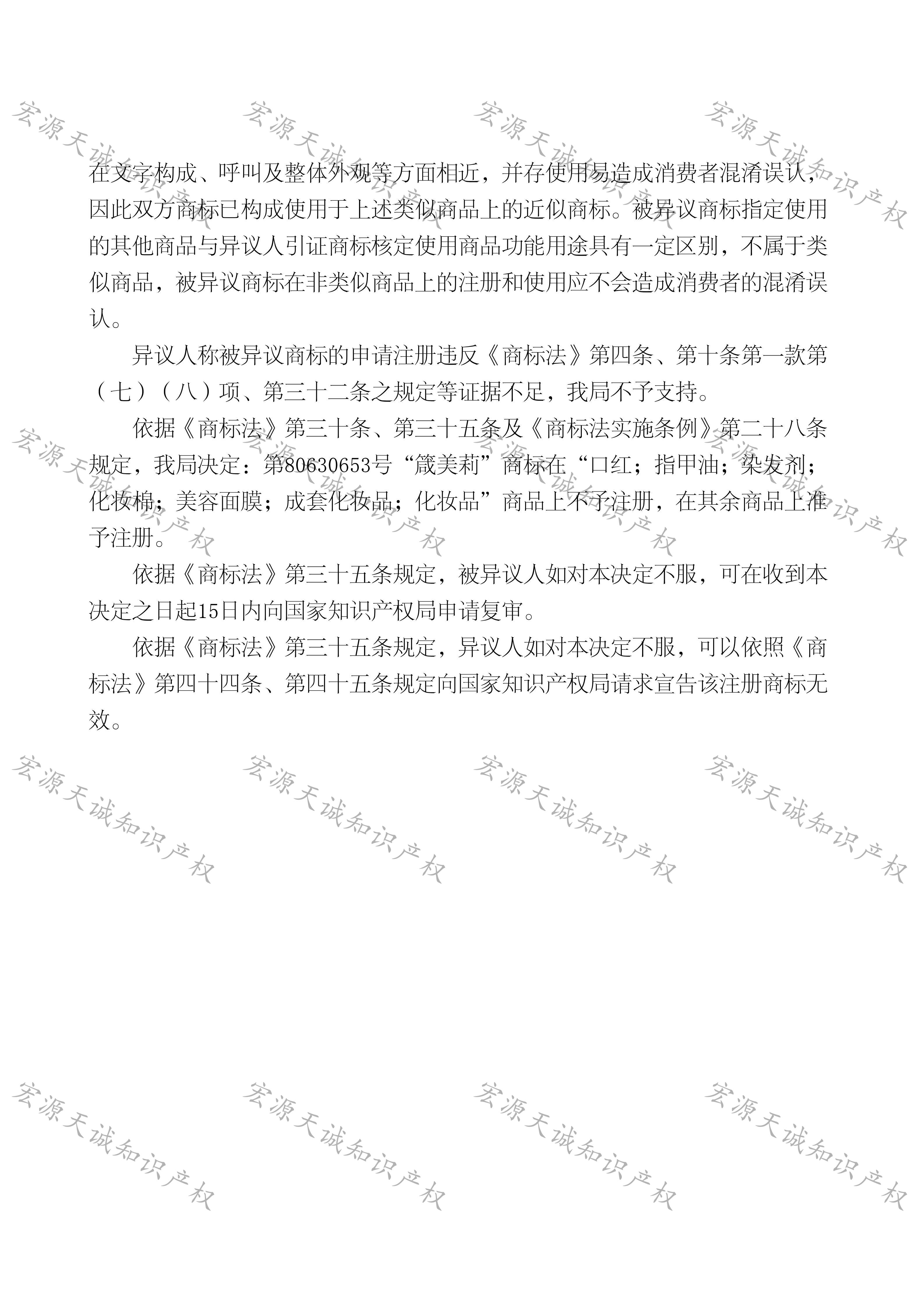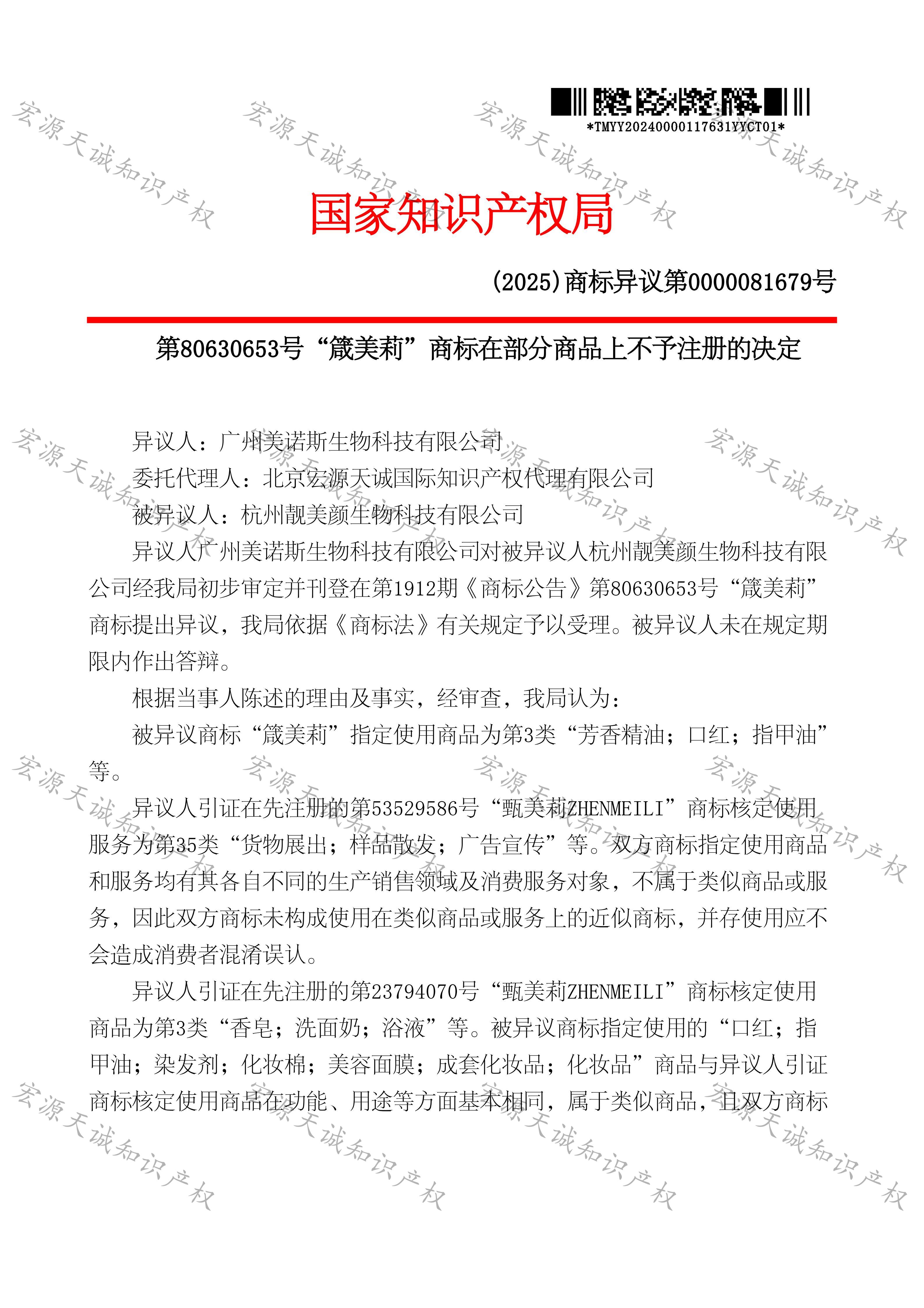 宏源天诚代理“箴美莉”商标提异议成功