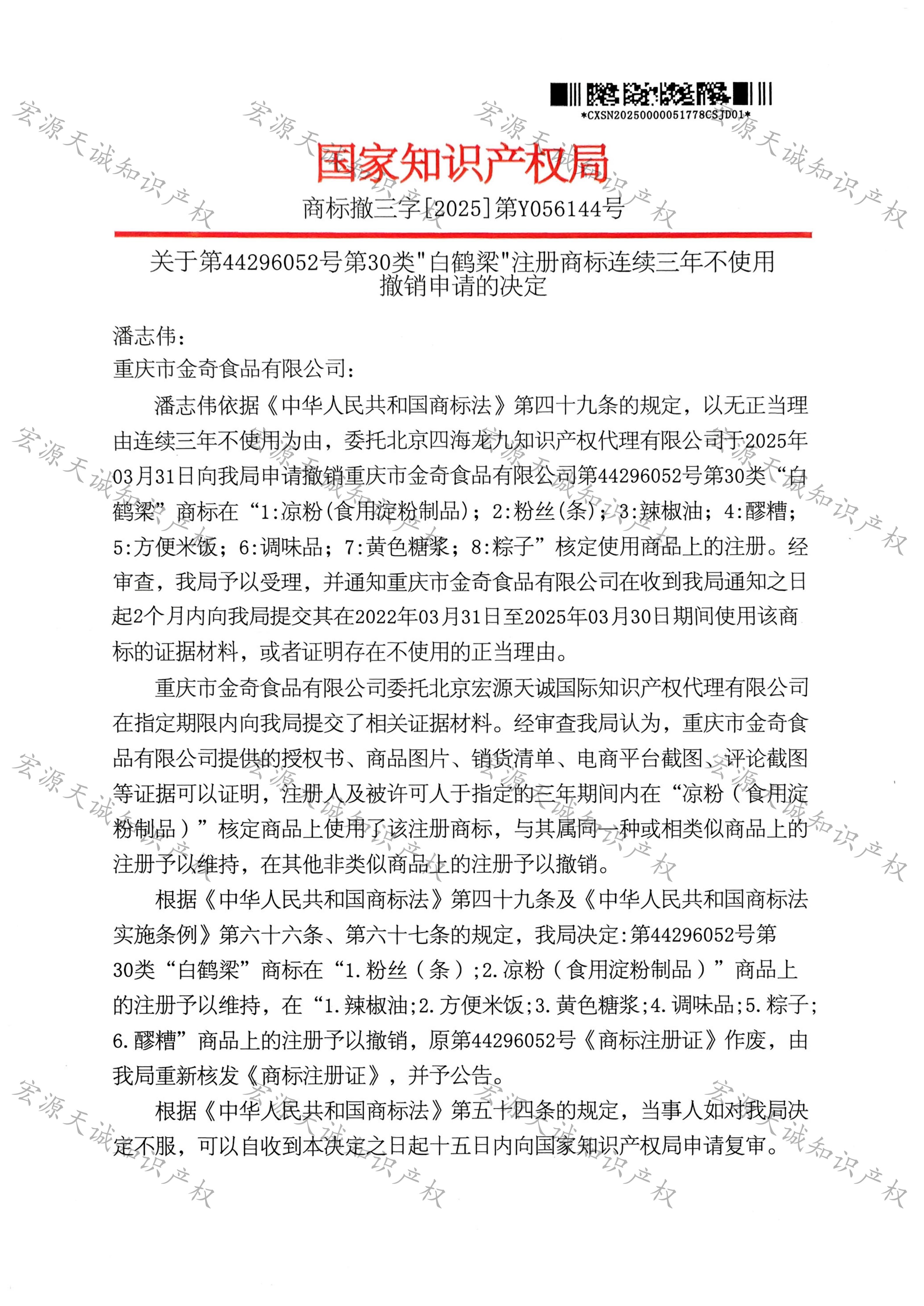 宏源天诚代理“白鹤梁”商标撤三答辩成功