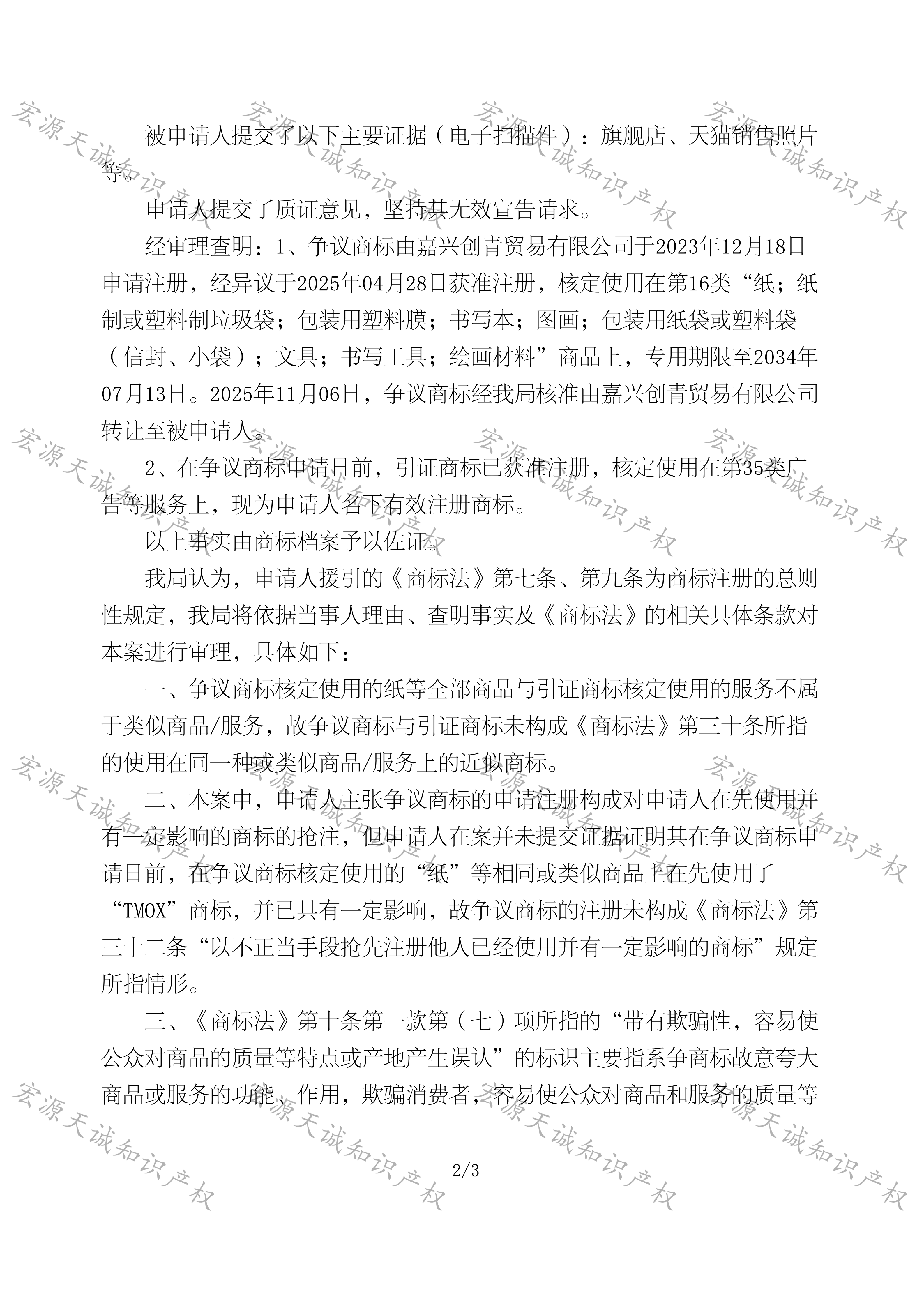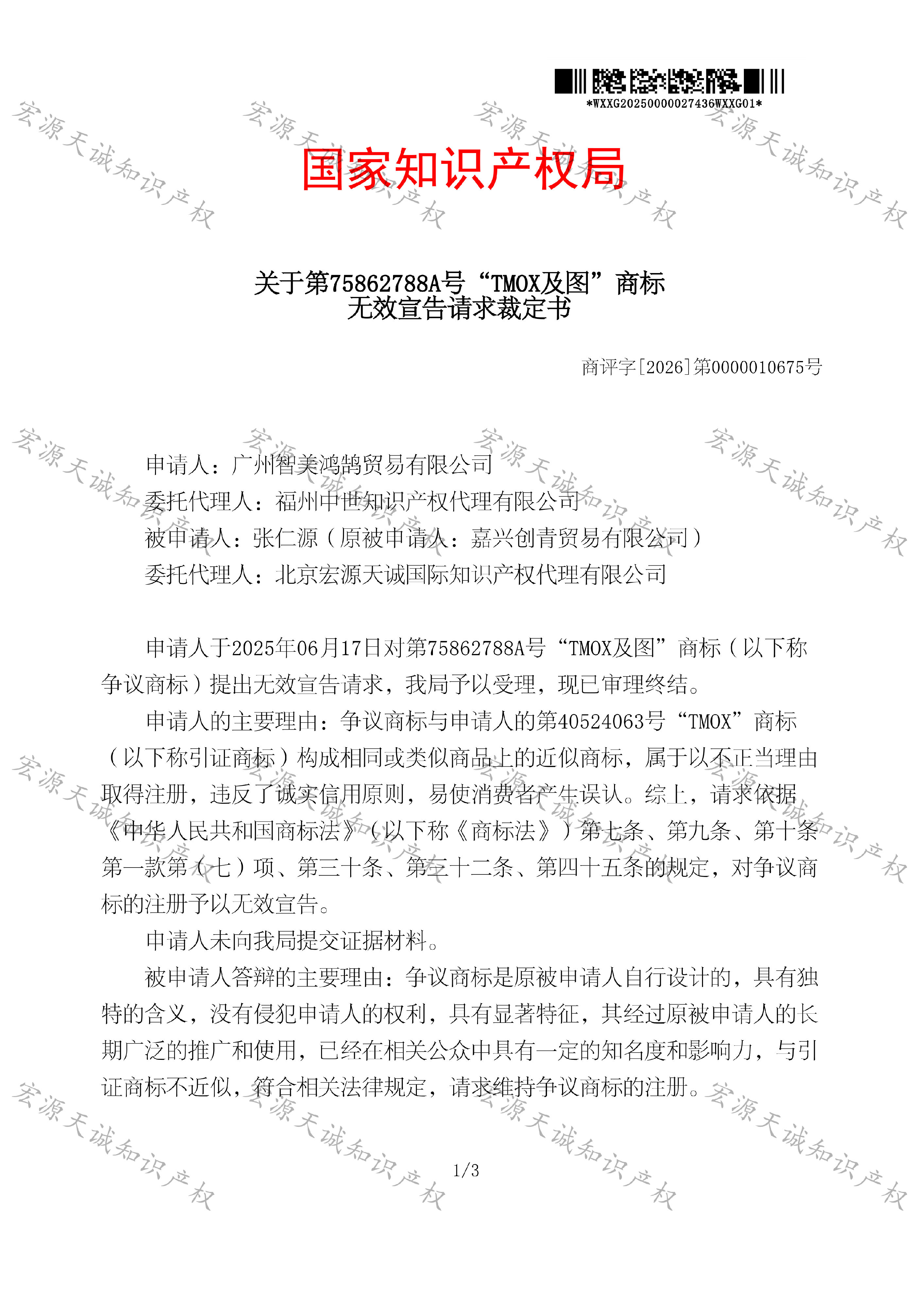 宏源天诚代理“TMOX”商标无效答辩成功
