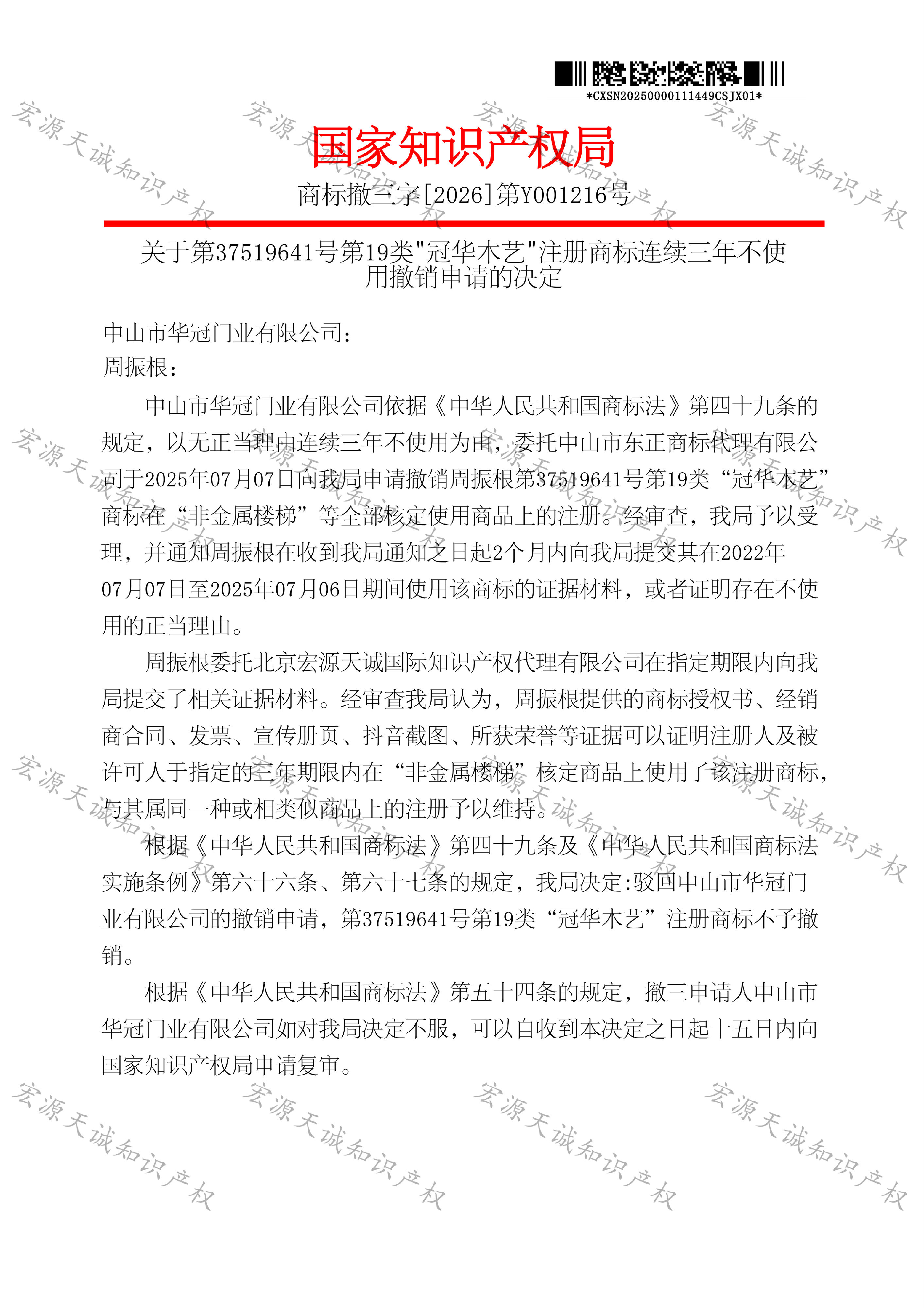 宏源天诚代理“冠华木艺”商标撤三答辩成功