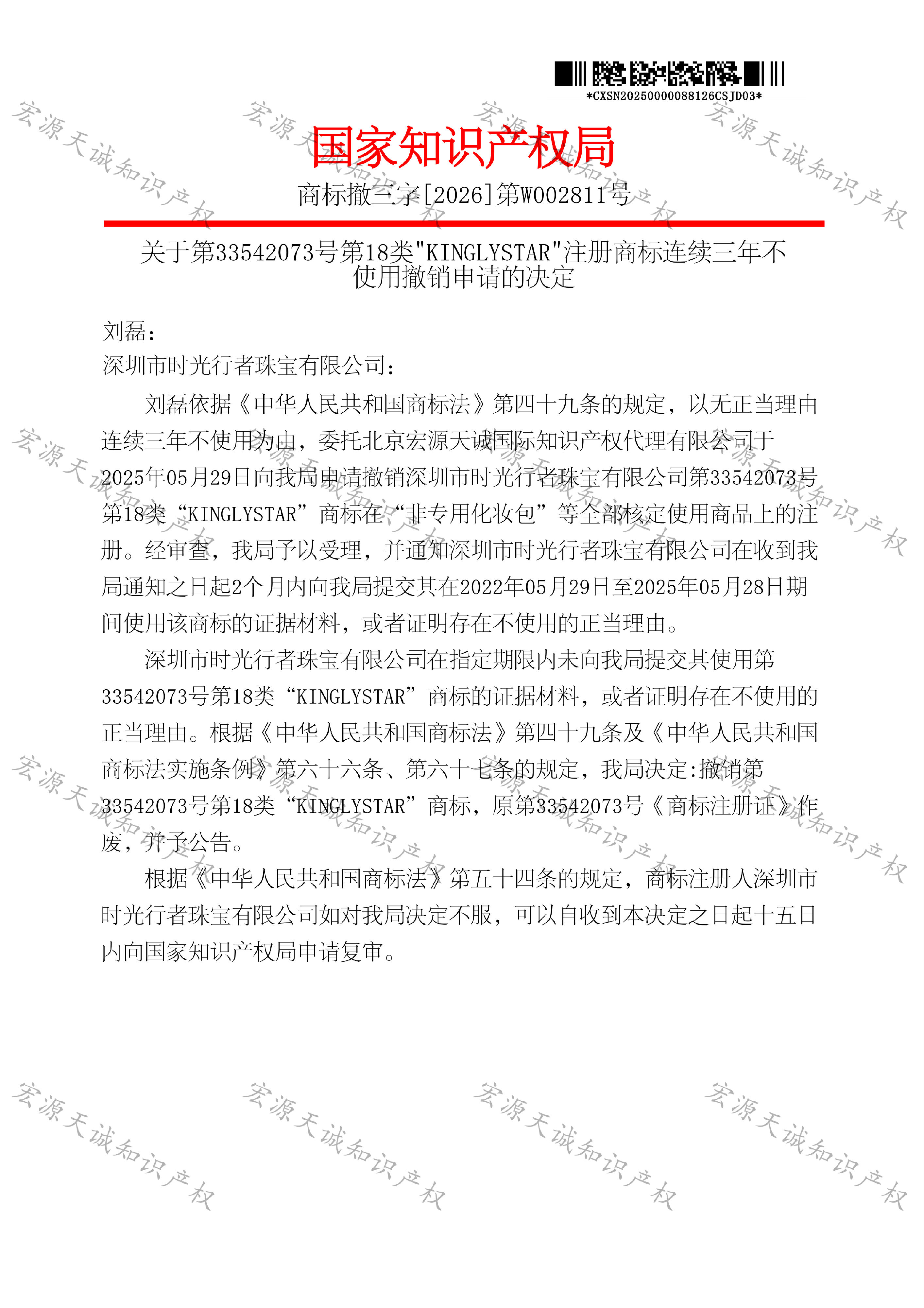 宏源天诚代理“KINGLYSTAR”商标提撤三成功
