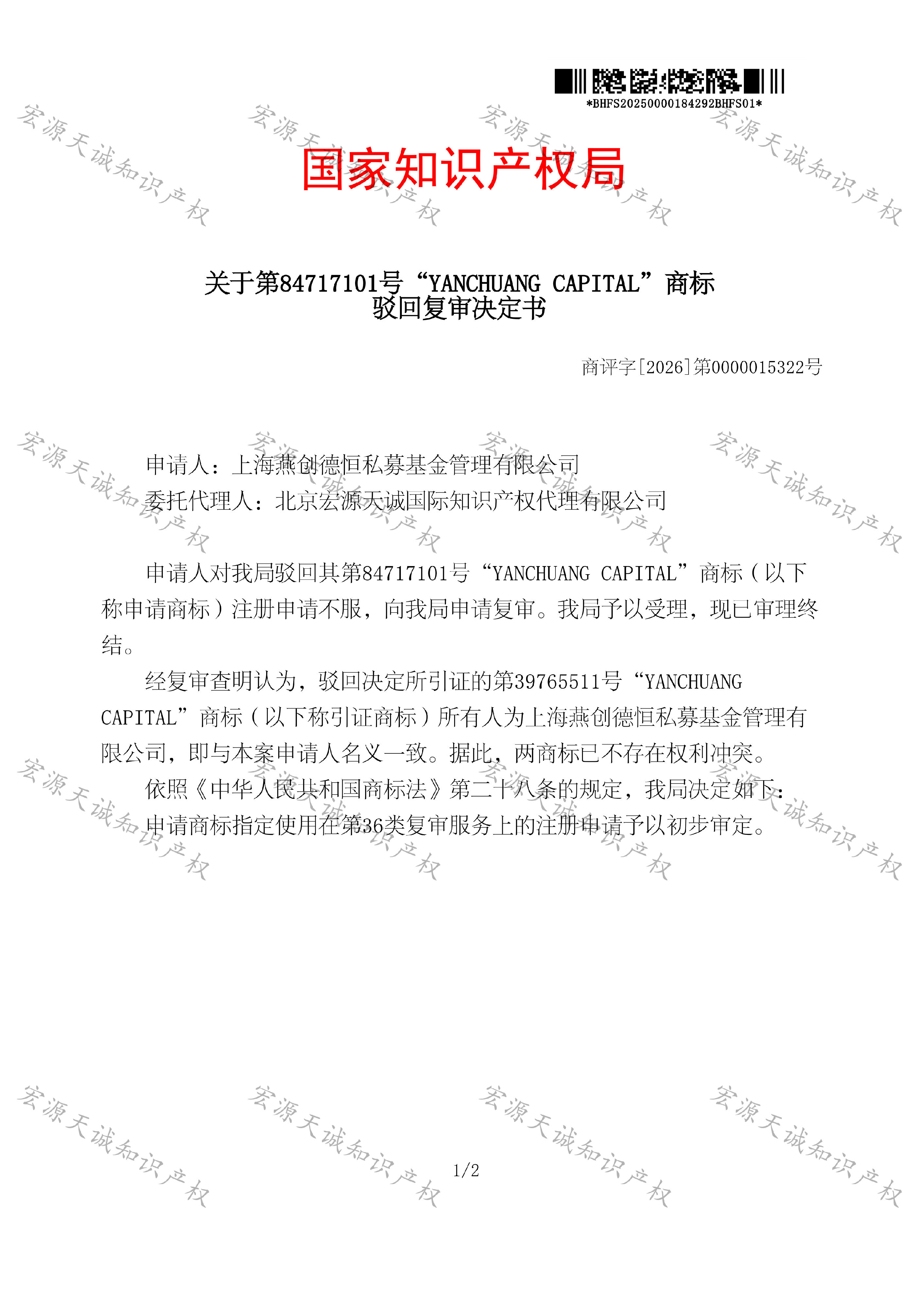 宏源天诚代理“YANCHUANG CAPITAL”商标驳回复审成功