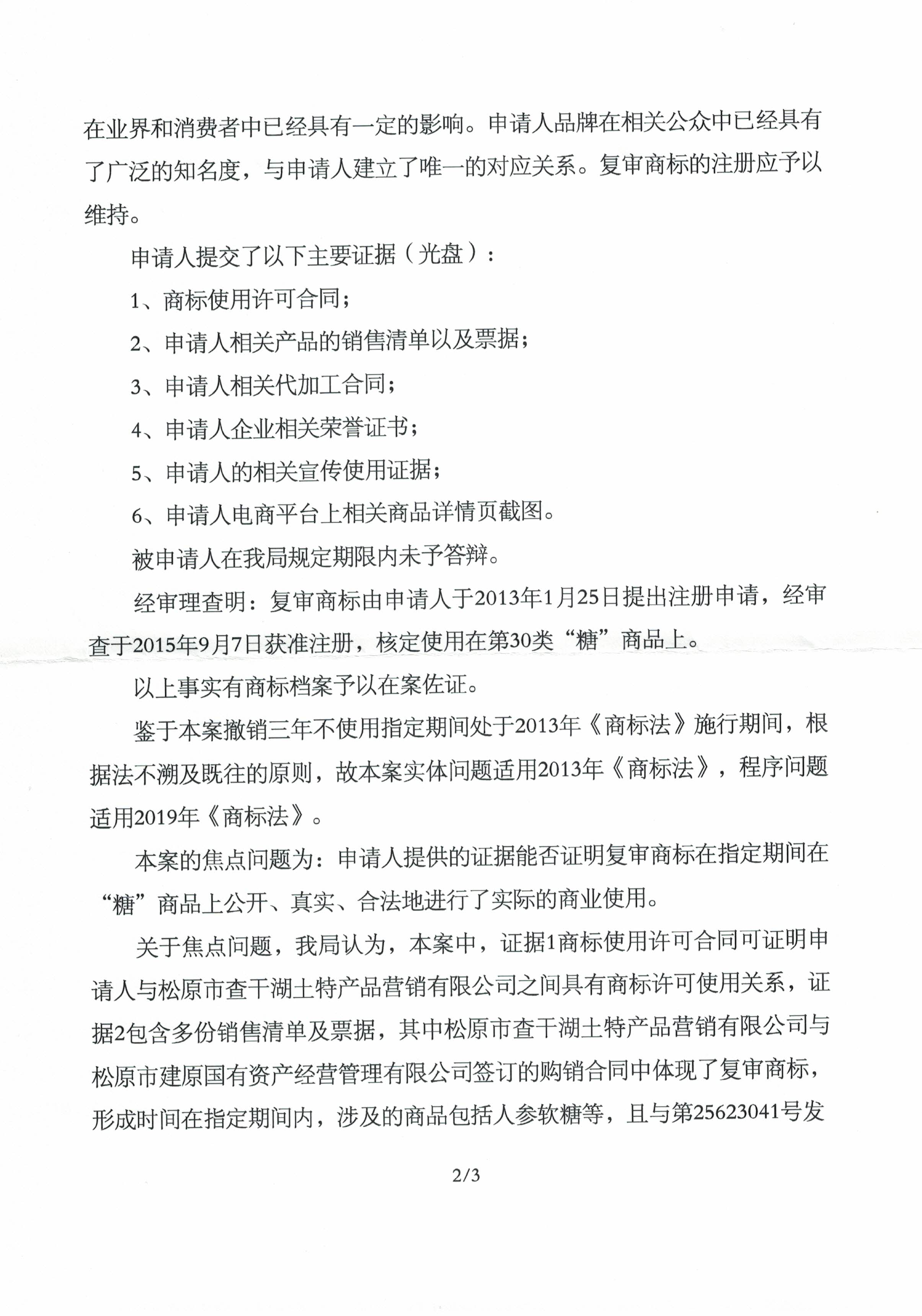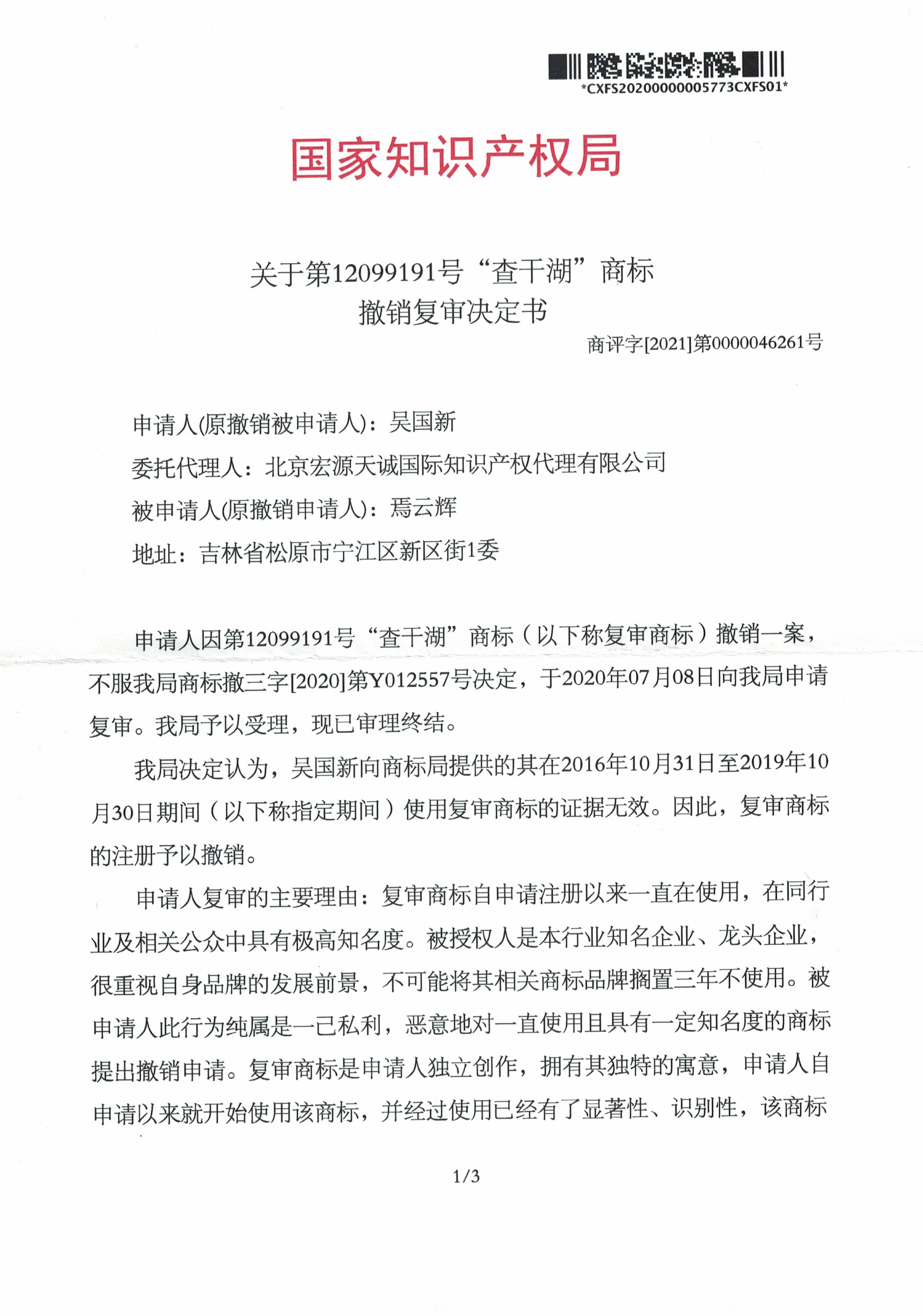 宏源天诚代理“查干湖”商标撤销复审成功