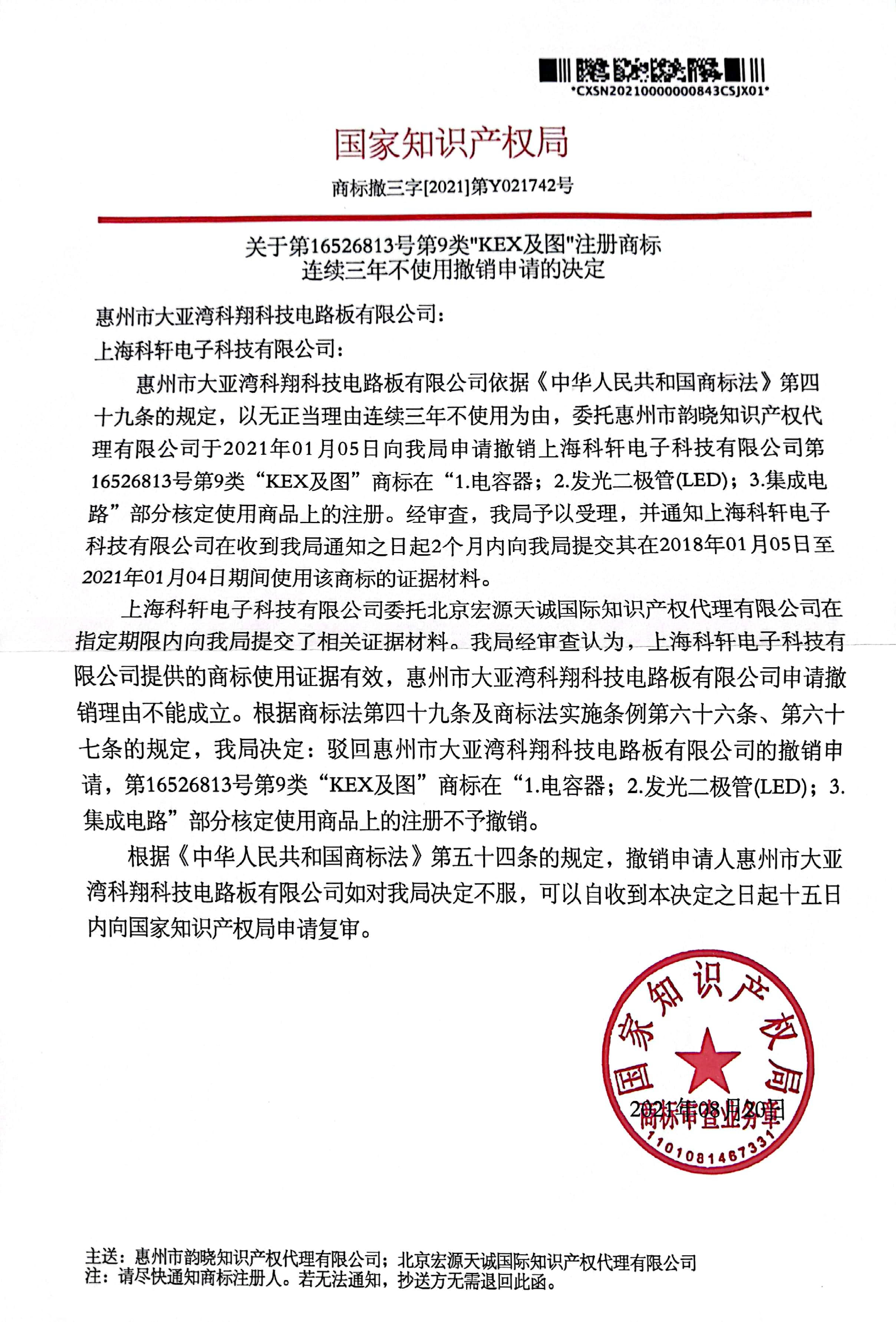 宏源天诚代理“KEX ”商标撤三答辩成功