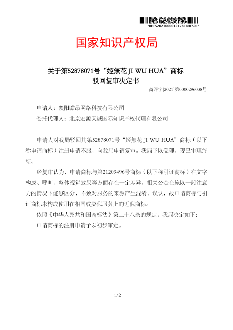 宏源天诚代理“姬无花 JI WU HUA及图 ”商标驳回复审成功