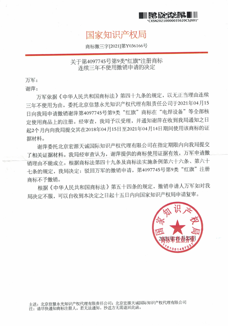 宏源天诚代理“红旗”商标撤三答辩成功