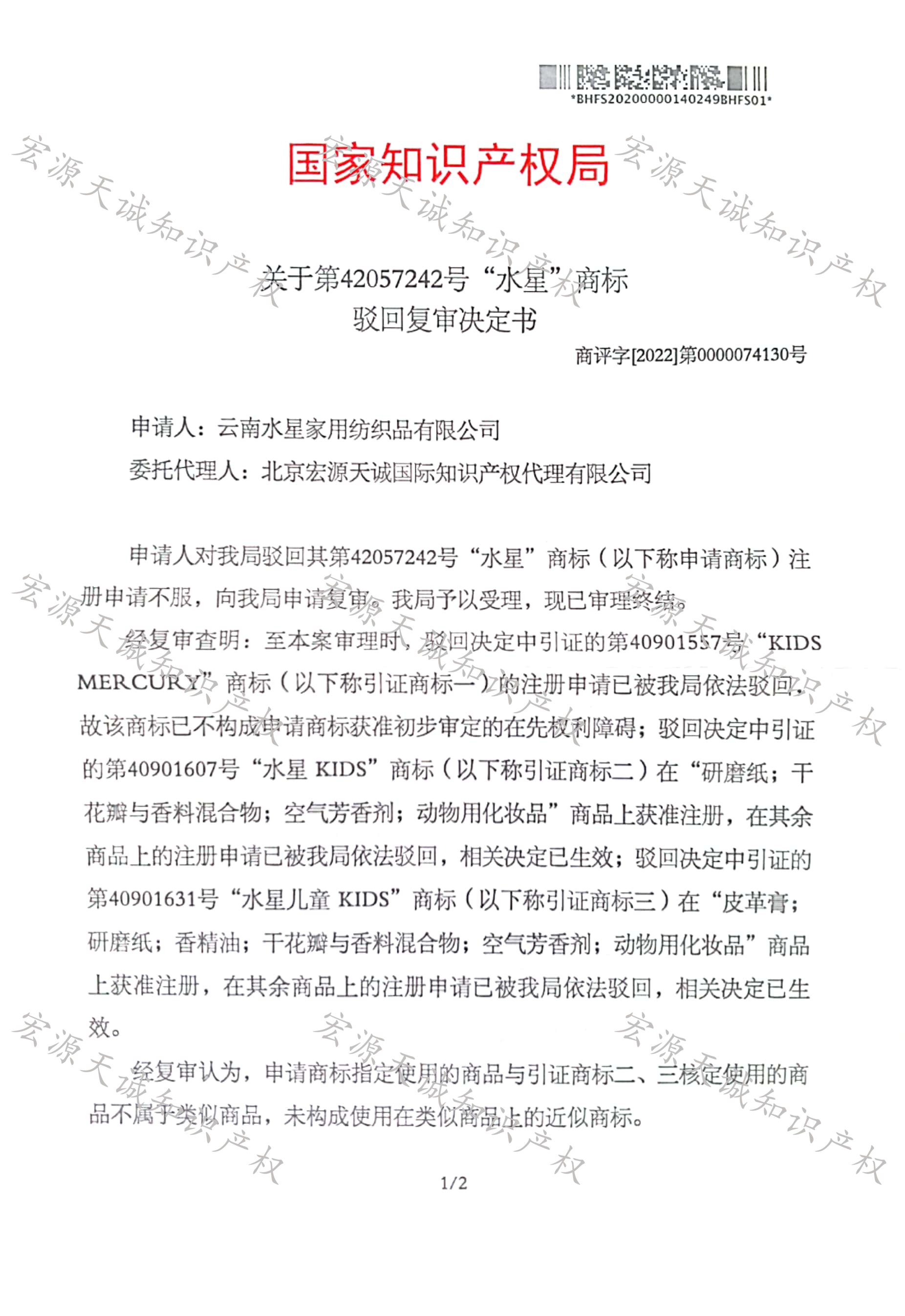 宏源天诚代理“水星 ”商标驳回复审成功