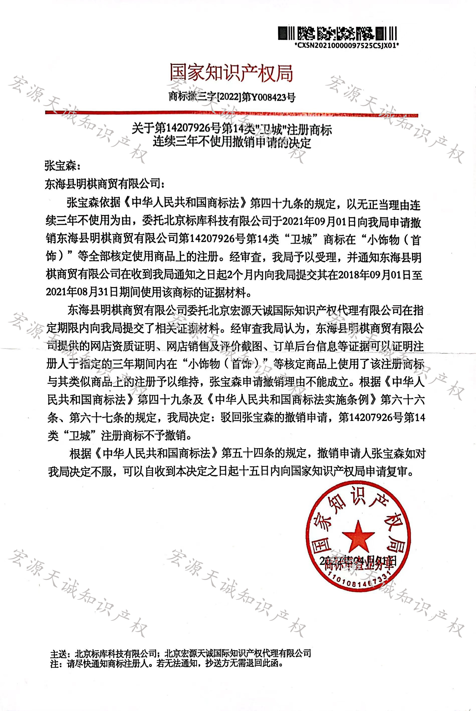 宏源天诚代理“卫城”商标撤三答辩成功