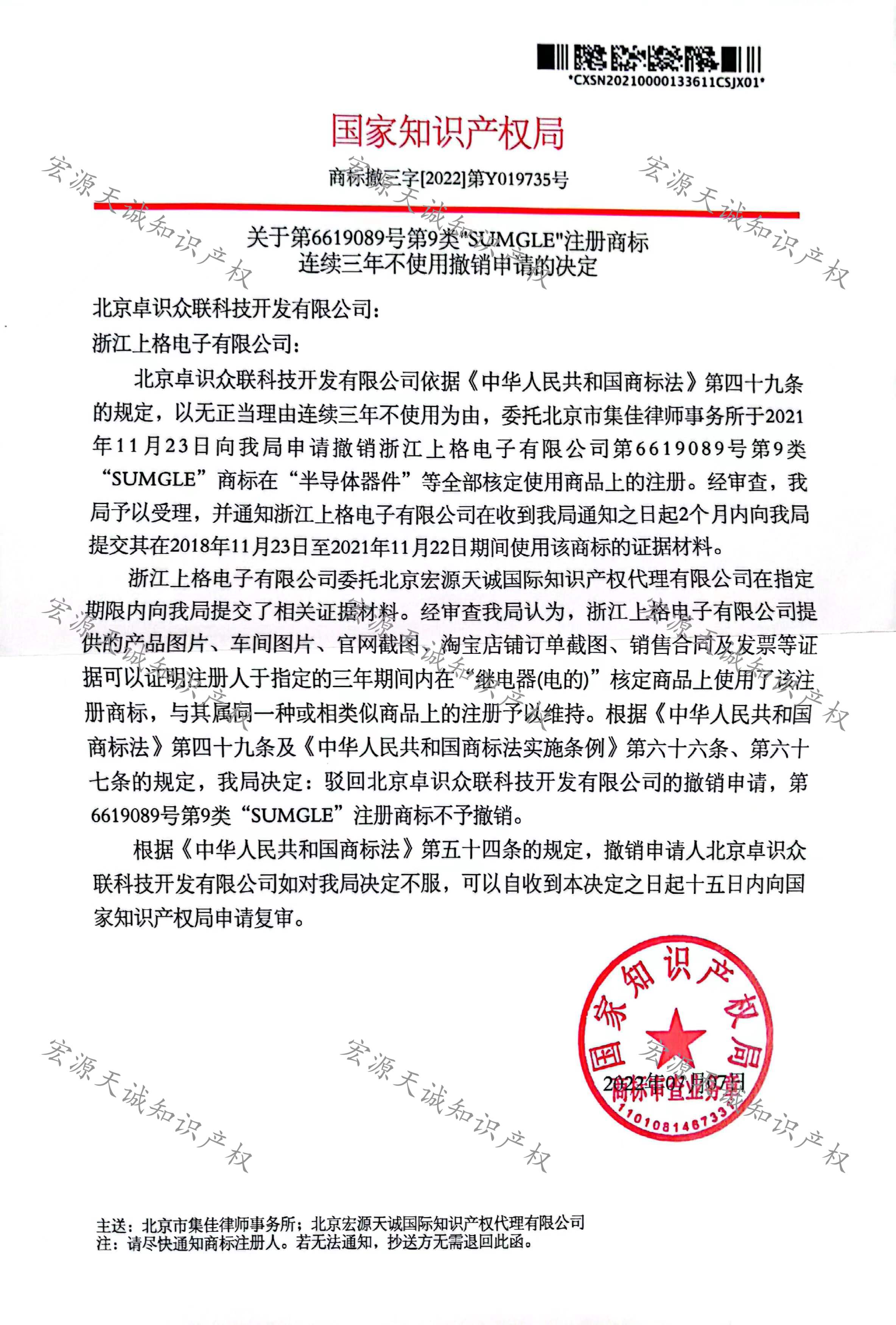 宏源天诚代理“SUMGLE”商标撤三答辩成功
